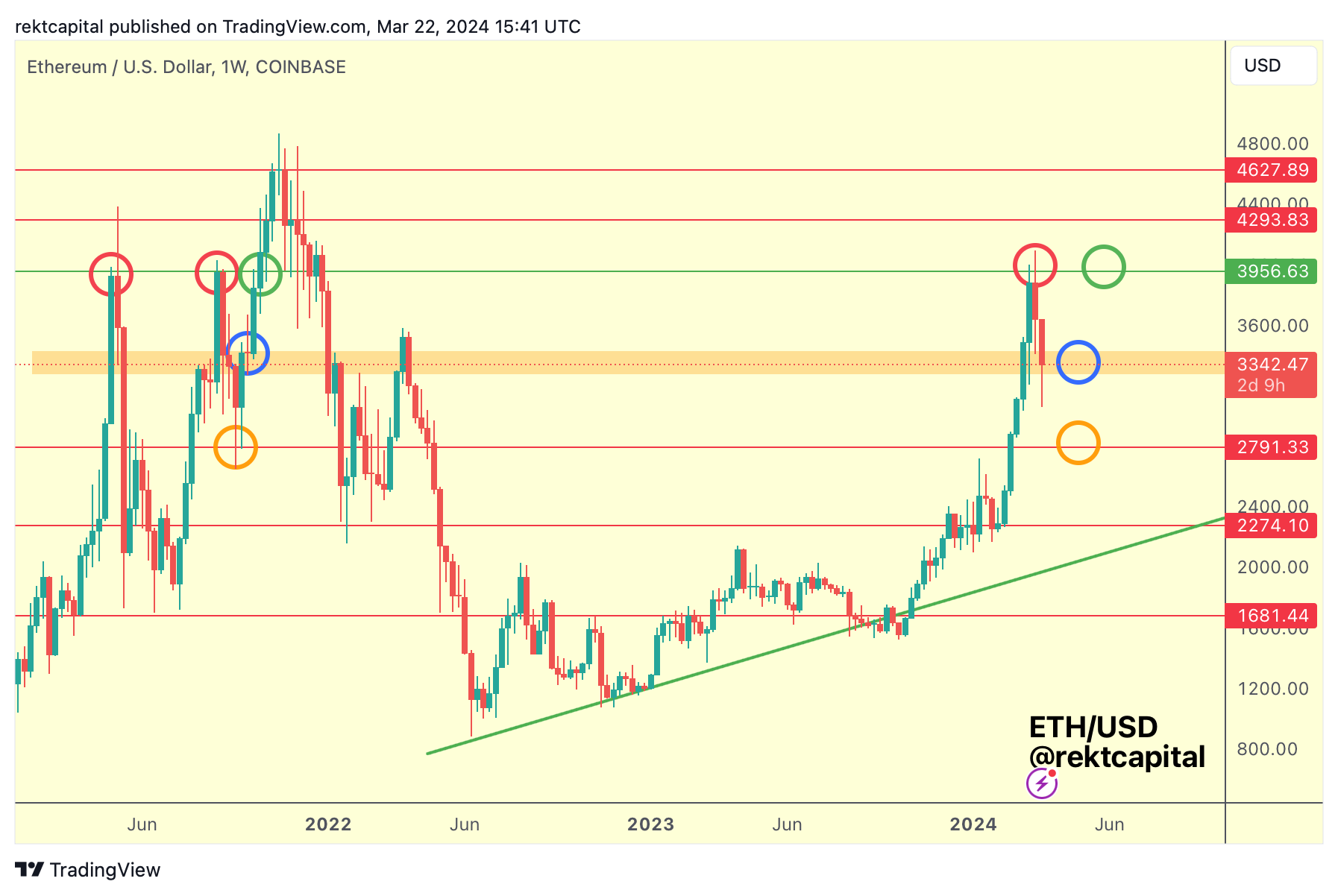 In the second half of 2021, when ETH rejected from the green $3956 resistance (red circle), price dropped to as low as the $2791 (orange circle) before rebounding and then reclaiming the orange boxed area as support (blue circle) before rallying and breaking beyond the green $3956 resistance for good (green circle).