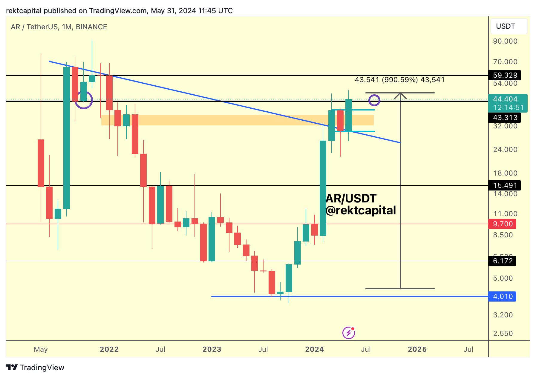 Now AR needs to Monthly Close above the black $43 level to position itself for a reclaim of the black-black ($43-$59) macro range.
