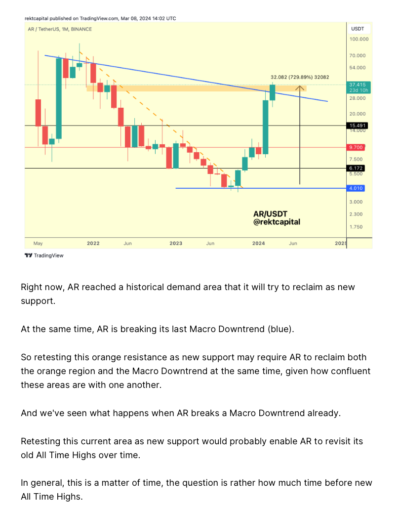 AR successfully retested the blue Macro Downtrend as support, enabling a transition into the light blue Bull Flag from which price recently brokeout to move to current highs.
