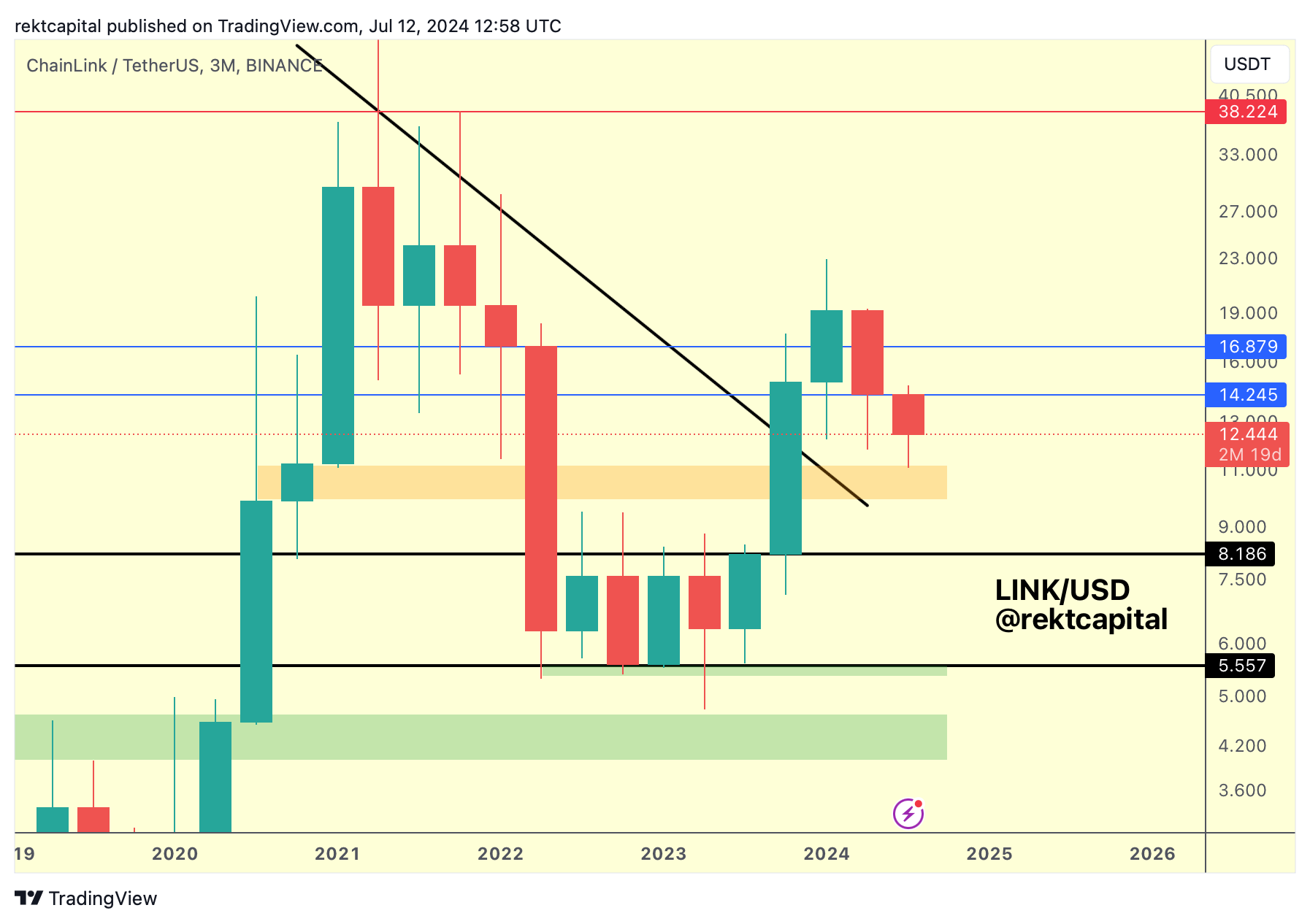 LINK has initially retested the top of this orange area as support earlier this Quarter but there's still a lot of time in the quarter which means that there's still scope for further retesting here over the coming months, if need be.