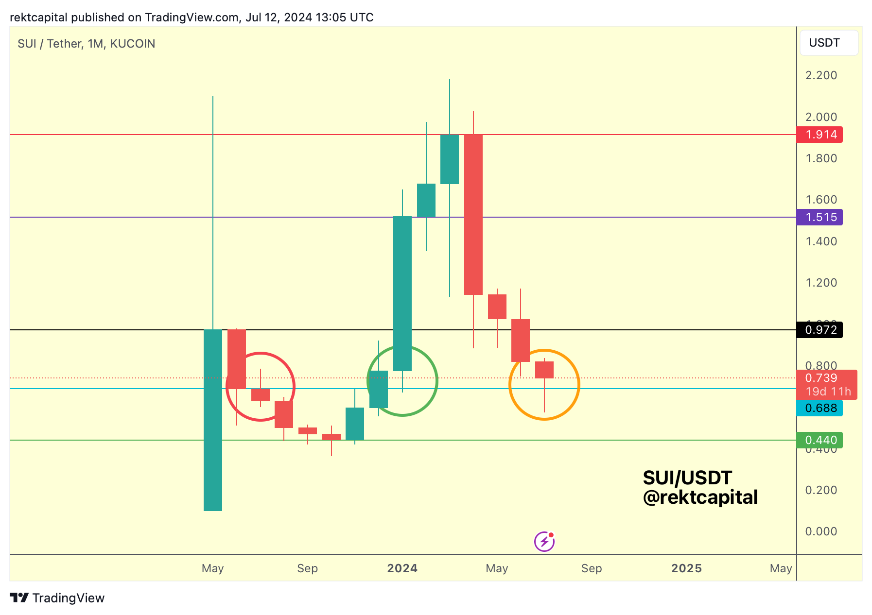 It's important to note that last month SUI Monthly Closed below the black level to lose said level as support; if SUI were to rebound soon, rally to the black level but only to reject from it, that would effectively confirm the black level as new resistance to fully confirm the breakdown from that old support.