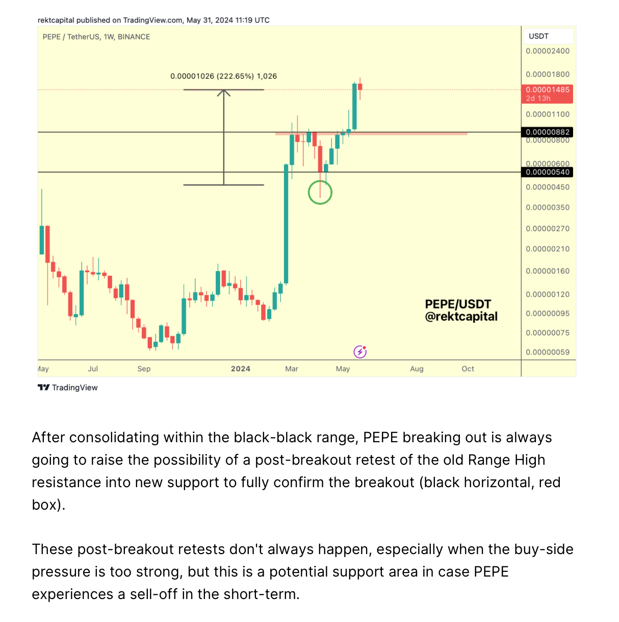 In late May, I shared my analysis on PEPE, anticipating a potential retrace in an effort to retest its post-breakout range: