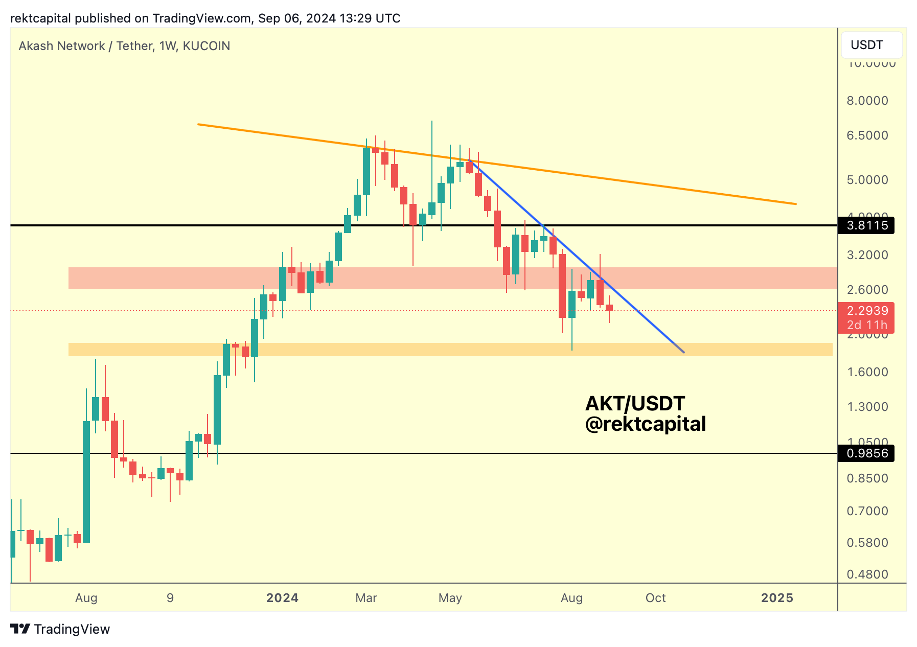 AKT would need to Weekly Close above the blue diagonal to kickstart a new uptrend but does AKT have the strength to breakout now that the blue Downtrend and red boxed resistance are acting as a confluent rejection zone?