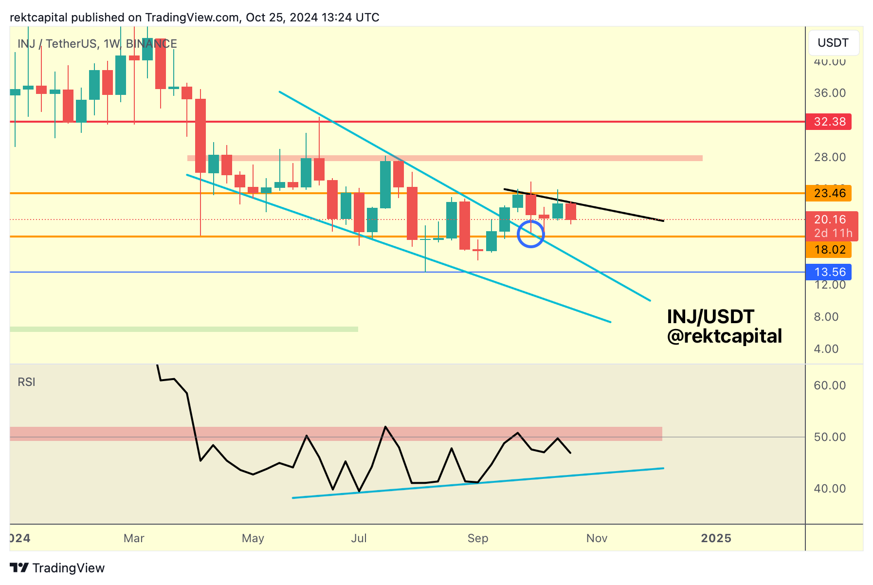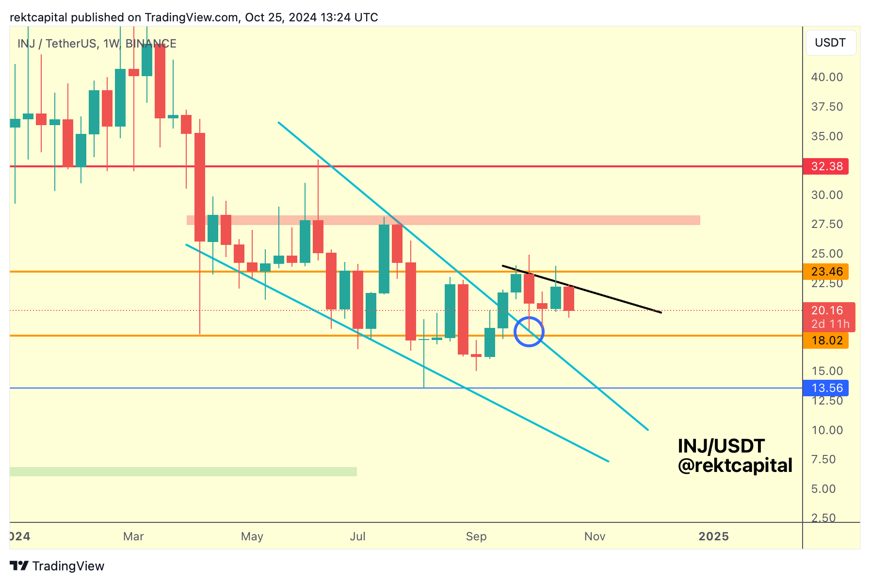 Since the transition into the range, INJ has continued to reject from the orange Range high of $23.46 and in fact, price has formed a Lower High (black) on these rejections.