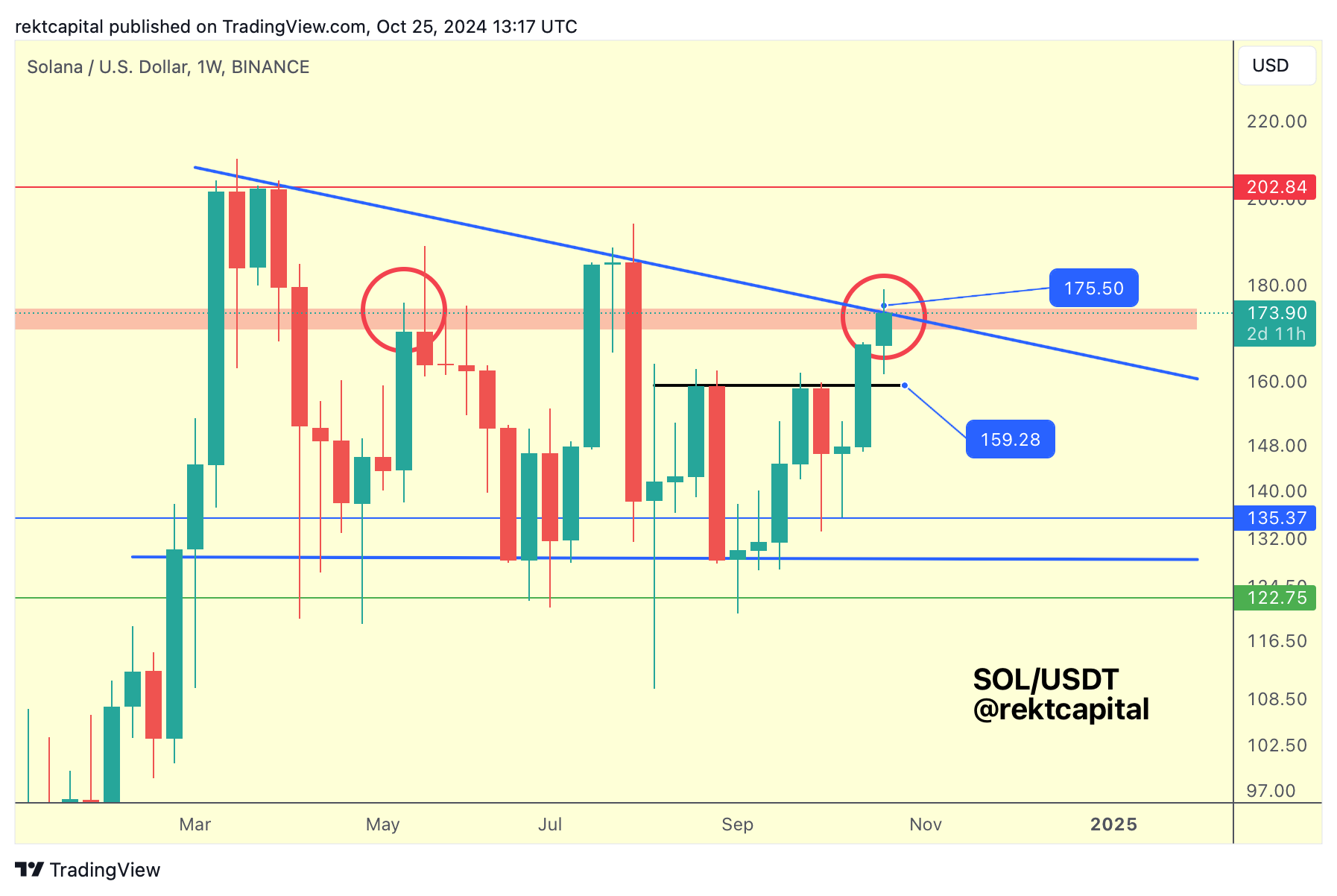 Of course, if SOL were to Weekly Close above the blue diagonal, then price wouldn't need a rejection and instead SOL would position itself for a breakout to $202 by first retesting the red boxed region as support.