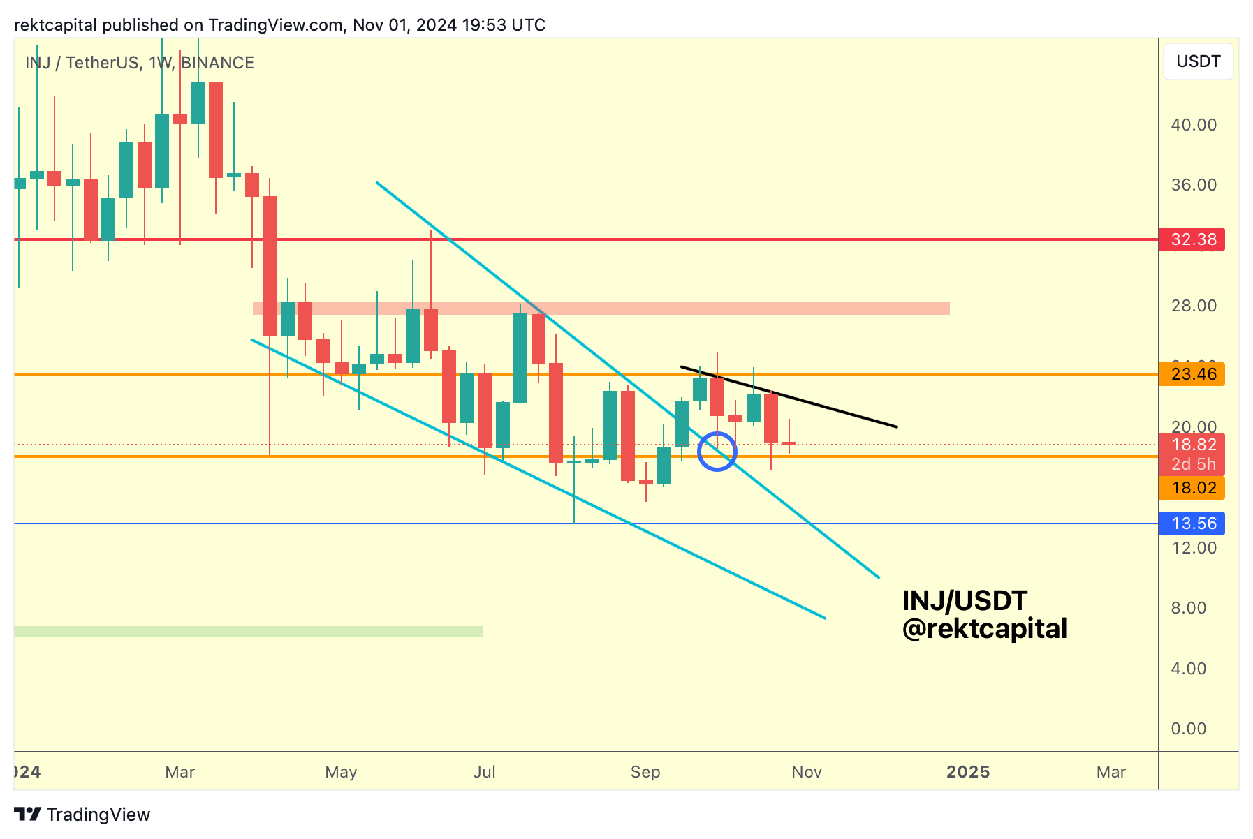 In this case, the INJ price action needs to Weekly Close above the Range Low of $18.02 (orange) to maintain its range and if INJ can continue maintaining stability above this level while the RSI drops into the Higher Low, then maybe price doesn't need to drop in tandem and lose the current range.