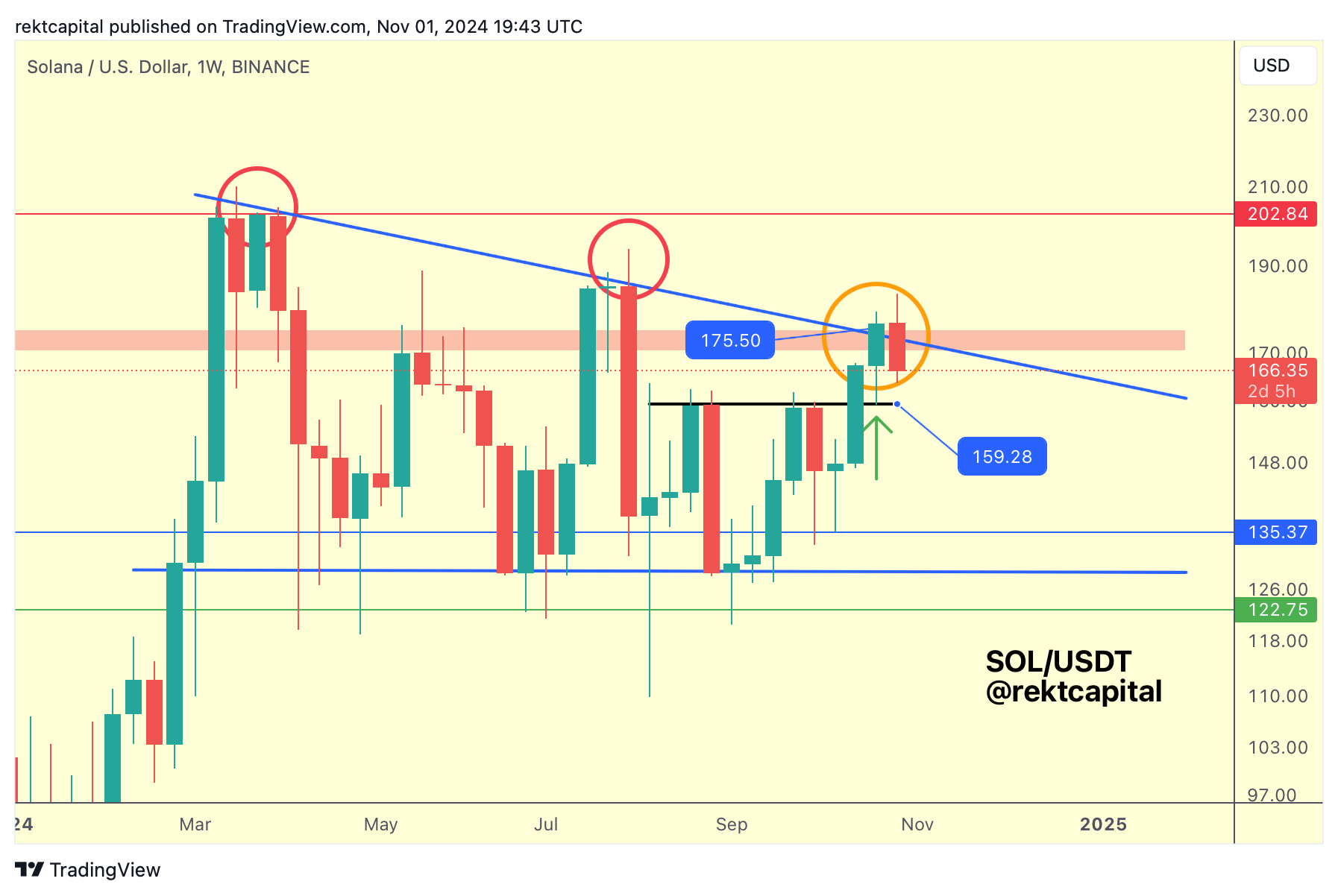 Every time price would revisit the blue diagonal, SOL would upside wicked beyond it but ultimately Weekly Close below it and reject from there.