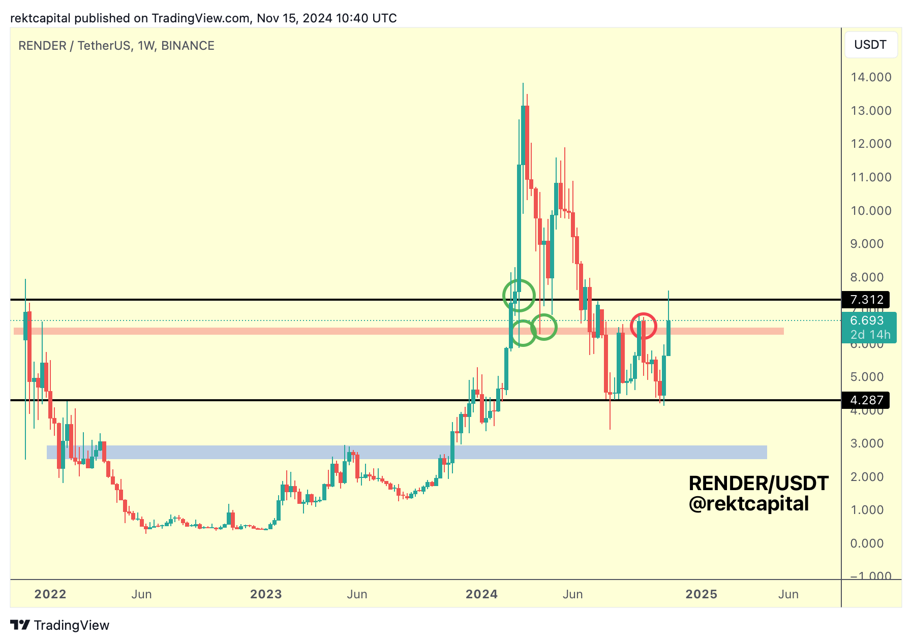 Whenever the red region has acted as support (green circles), this has supported RENDER above the $7.31 Range High resistance.