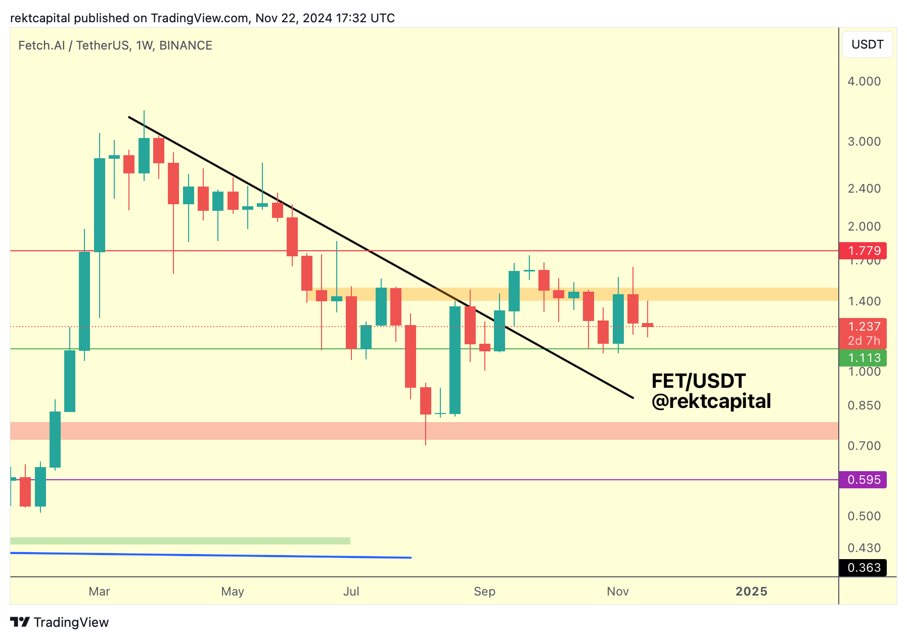 In recent weeks, FET has been rejecting from the orange area; orange has been acting as resistance, which means that FET could still drop into the Range Low for a retest.