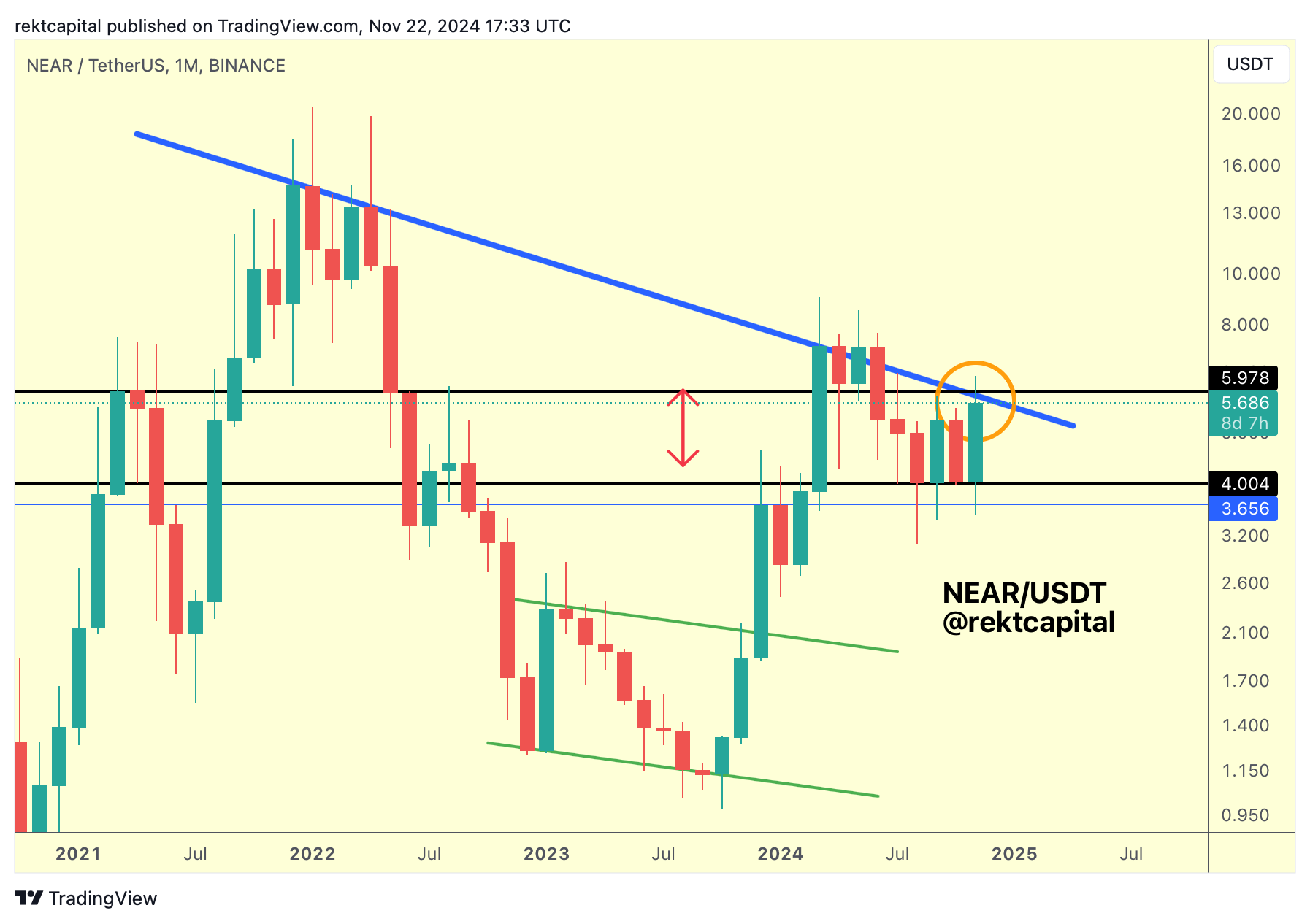 NEAR needs a Monthly Close above the Macro Downtrend (blue) to kickstart trend continuation in its new Macro Uptrend which began in late 2023.
