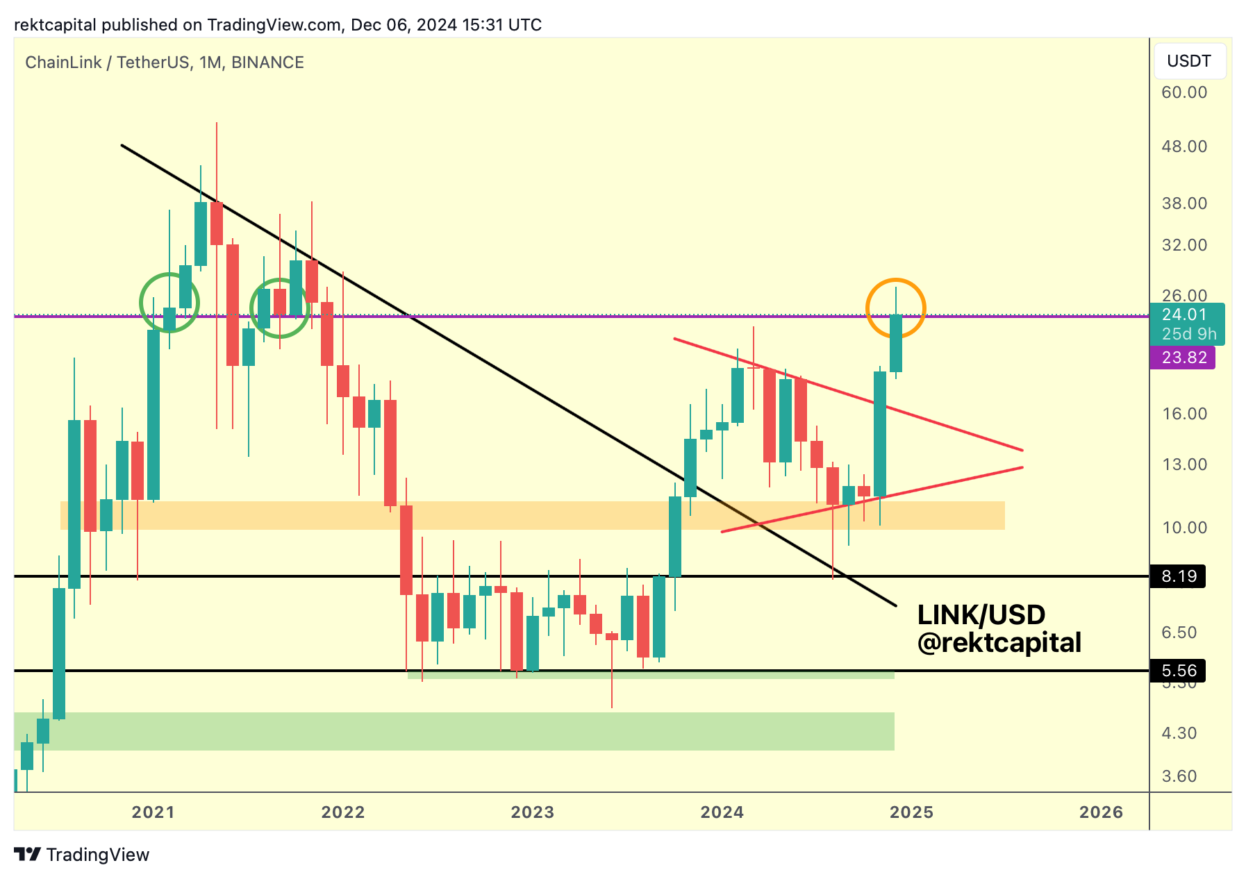 Nonetheless, LINK has broken out from its red Monthly triangle and is now trying to position itself favourably for a reclaim of the $23.82 (purple) level into new support.