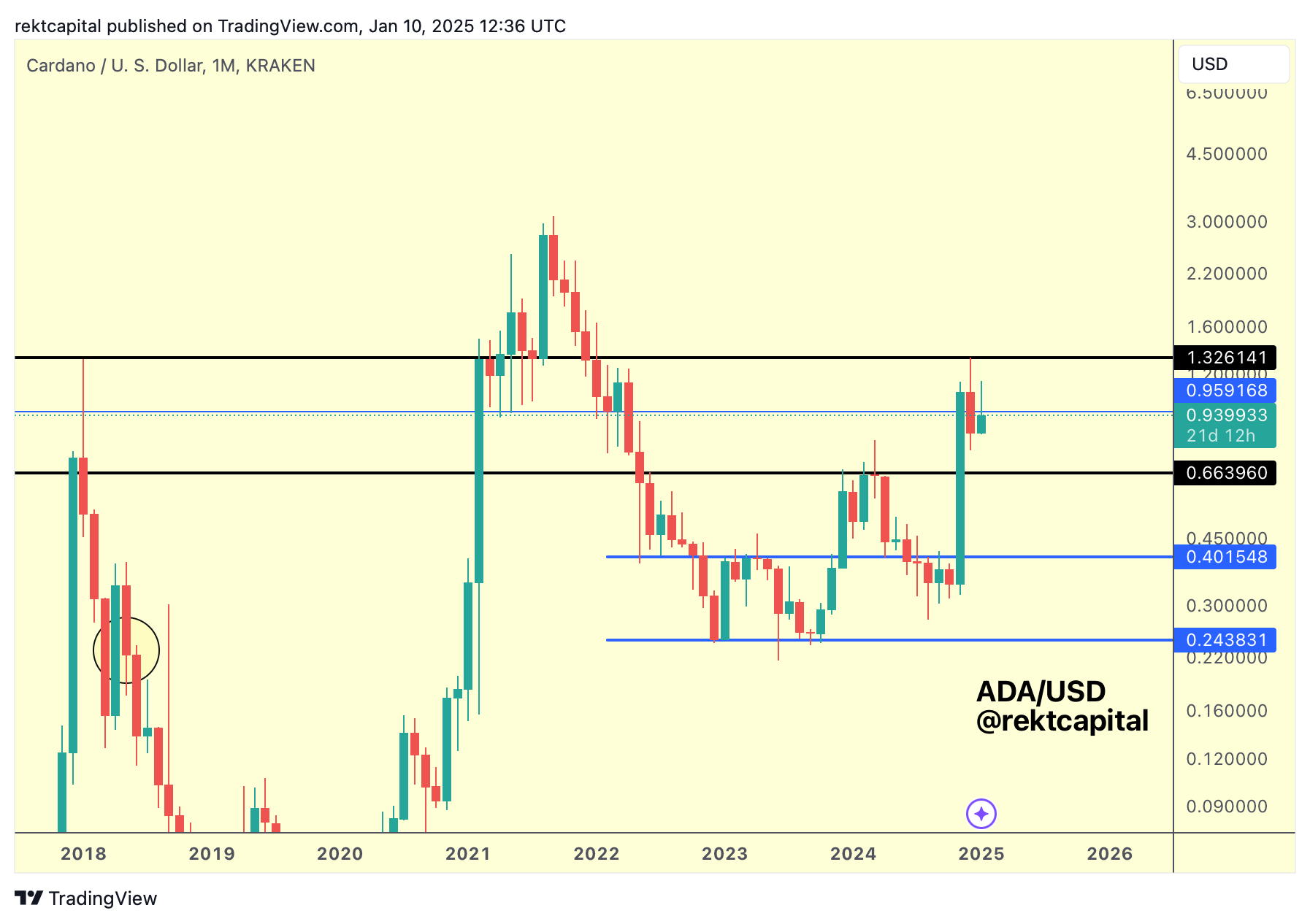 The $1.32 resistance is the old All Time High resistance from late 2017 and the $0.66 support represents the late 2023, early 2024 highs.