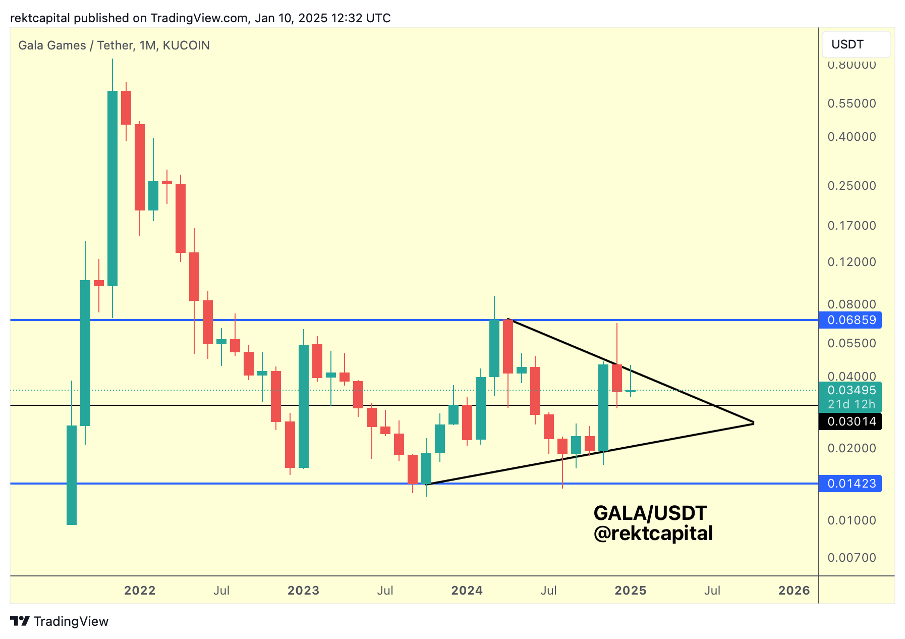 Macro-wise, GALA is still in its macro range-bound construction between $0.01-$0.06 (blue-blue), with the mid-point of this range being the blue $0.03 horizontal.