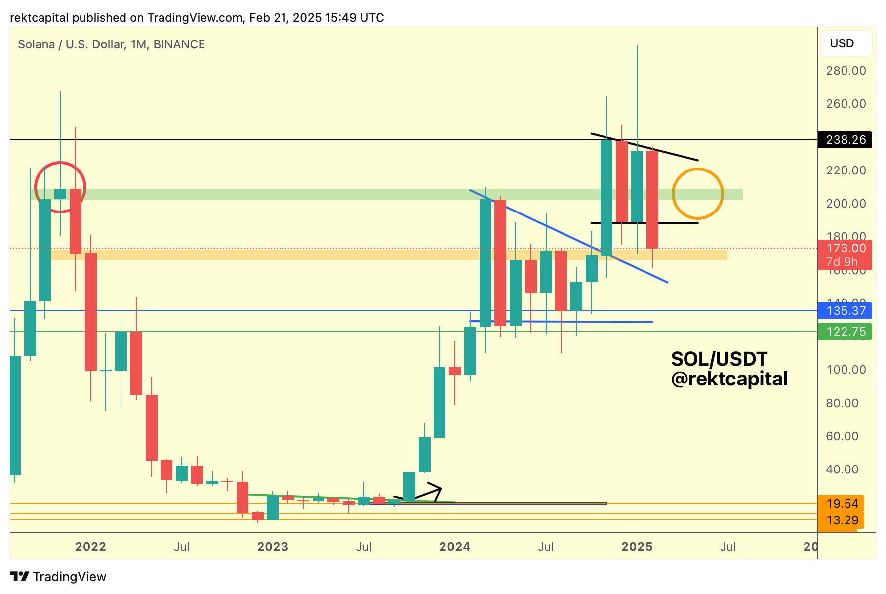 Over the past few months, SOL has been downside wicking into this orange area and this month, SOL has downside wicked even deeper, getting closer to tagging the blue diagonal which represents the previous re-accumulation structure that SOL broke out from a few months ago.