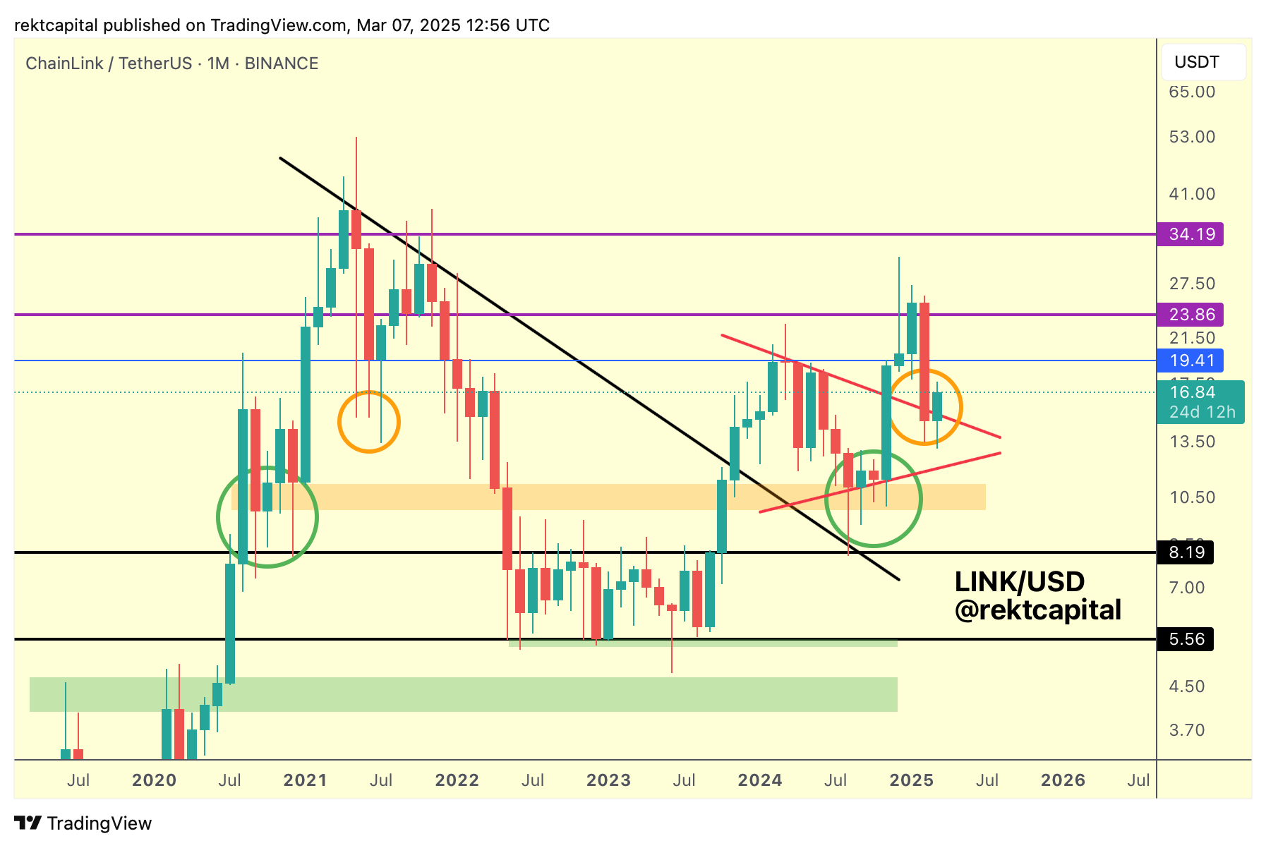 In mid-2024, LINK confirmed a successful retest in the orange boxed historical demand area to repeat history with a rebound to the upside.