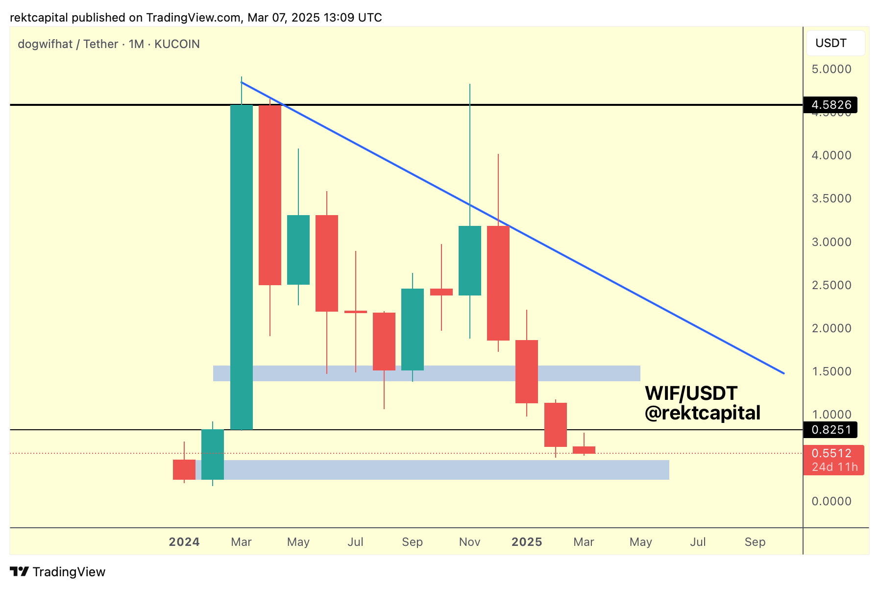 WIF recently Monthly Closed below the black $0.82 support and price has incidentally upside wicked into this level this month to showcase initial signs of said level flipping into new resistance.