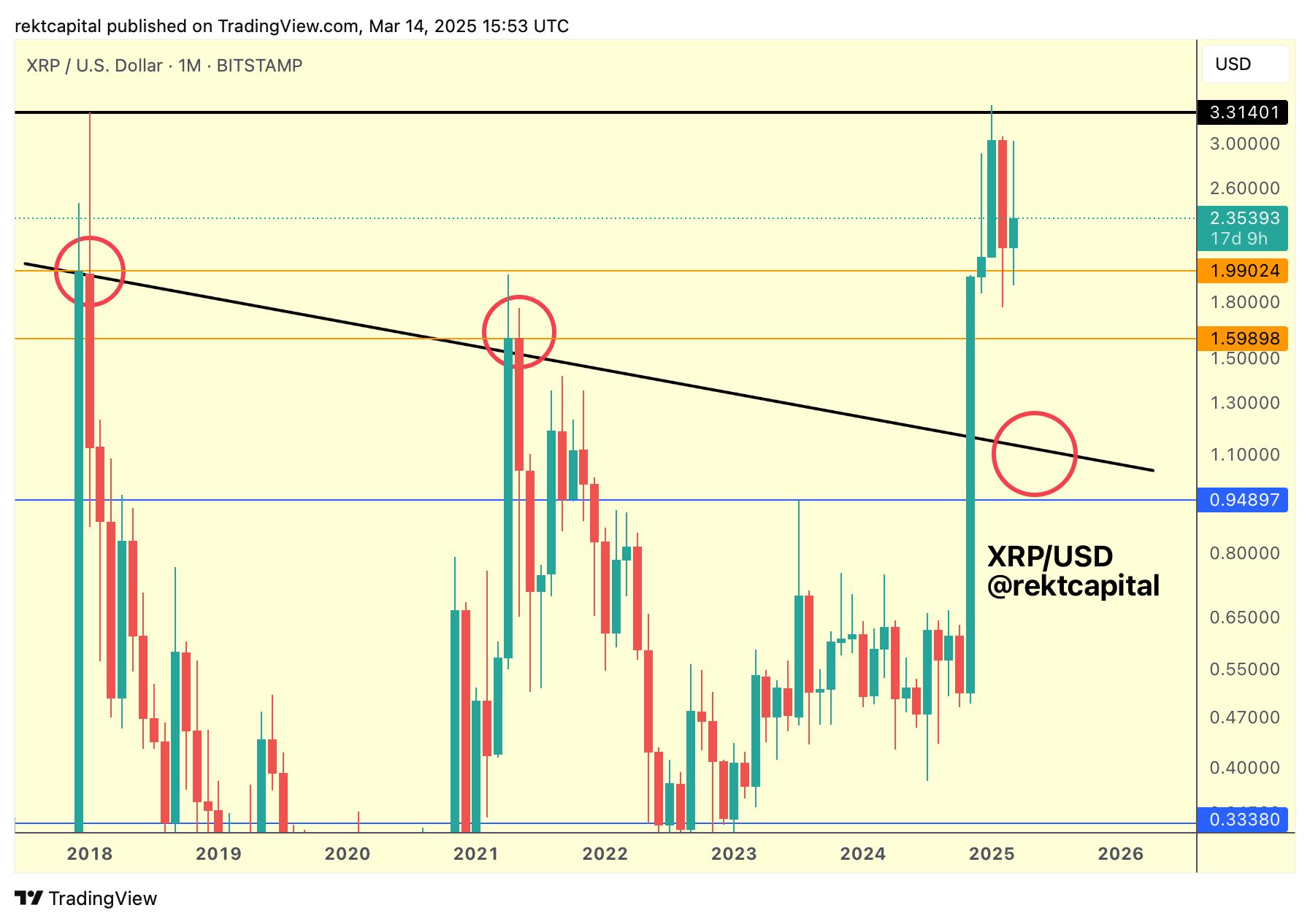 So even though price rebounded from the 2018 Monthly resistance (orange), XRP will need to reclaim the green technical uptrend to resynchronise that said trend.