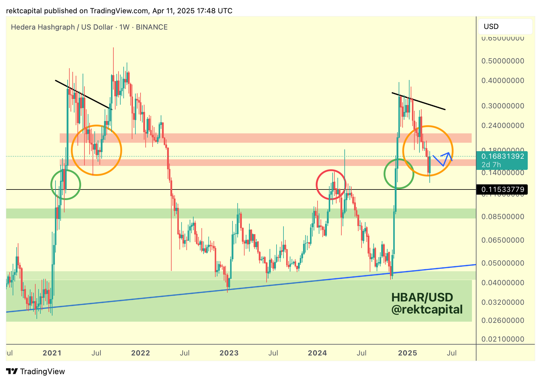 So effectively, HBAR needs to Weekly Close just like this to position itself for a post-breakout pullback to confirm a reclaim of this red area back into support: