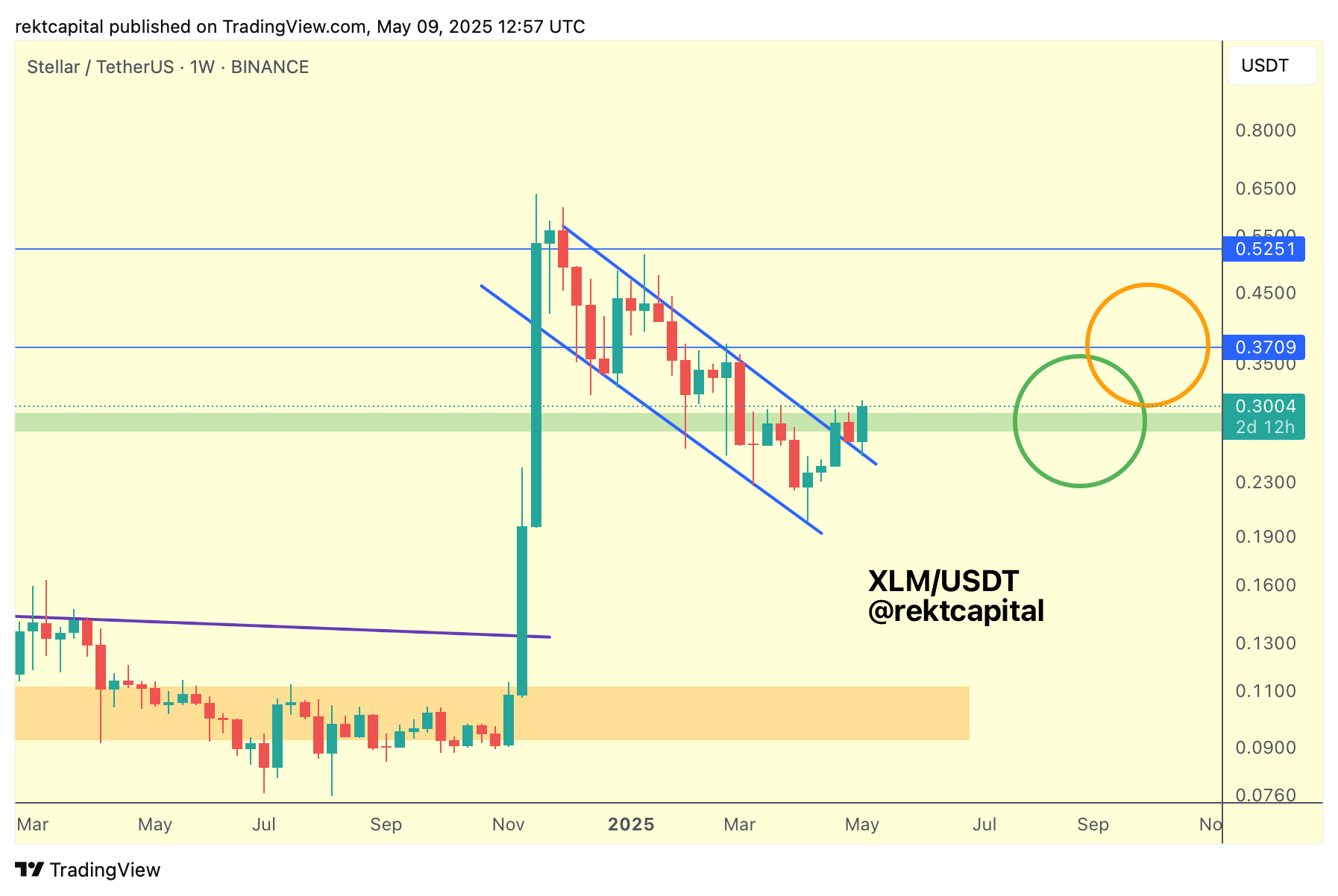 Now once XLM Weekly Closes above the green area, any dips into the green area would figure as a successful reclaim of green as support to enable a move to the orange circled region above.