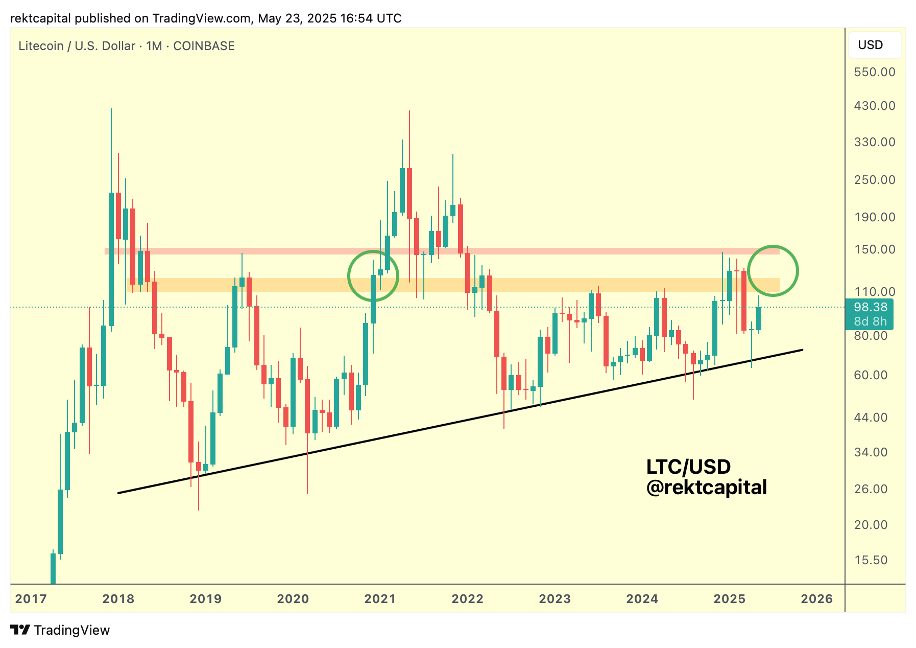 Litecoin just needs a Monthly Close above the orange resistance followed by a successful retest to breakout beyond the red region of resistance into the $150+ levels.