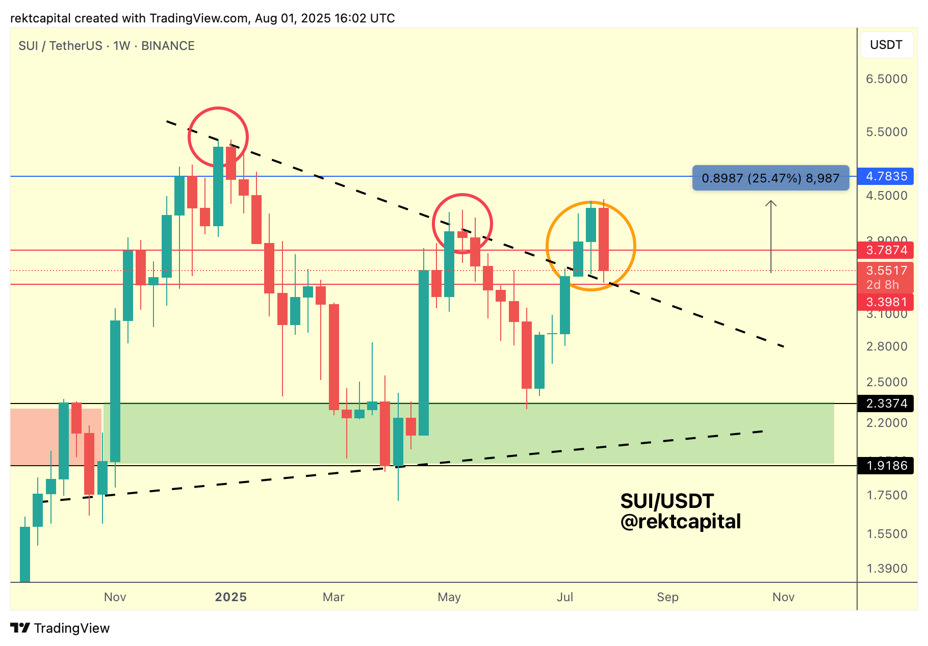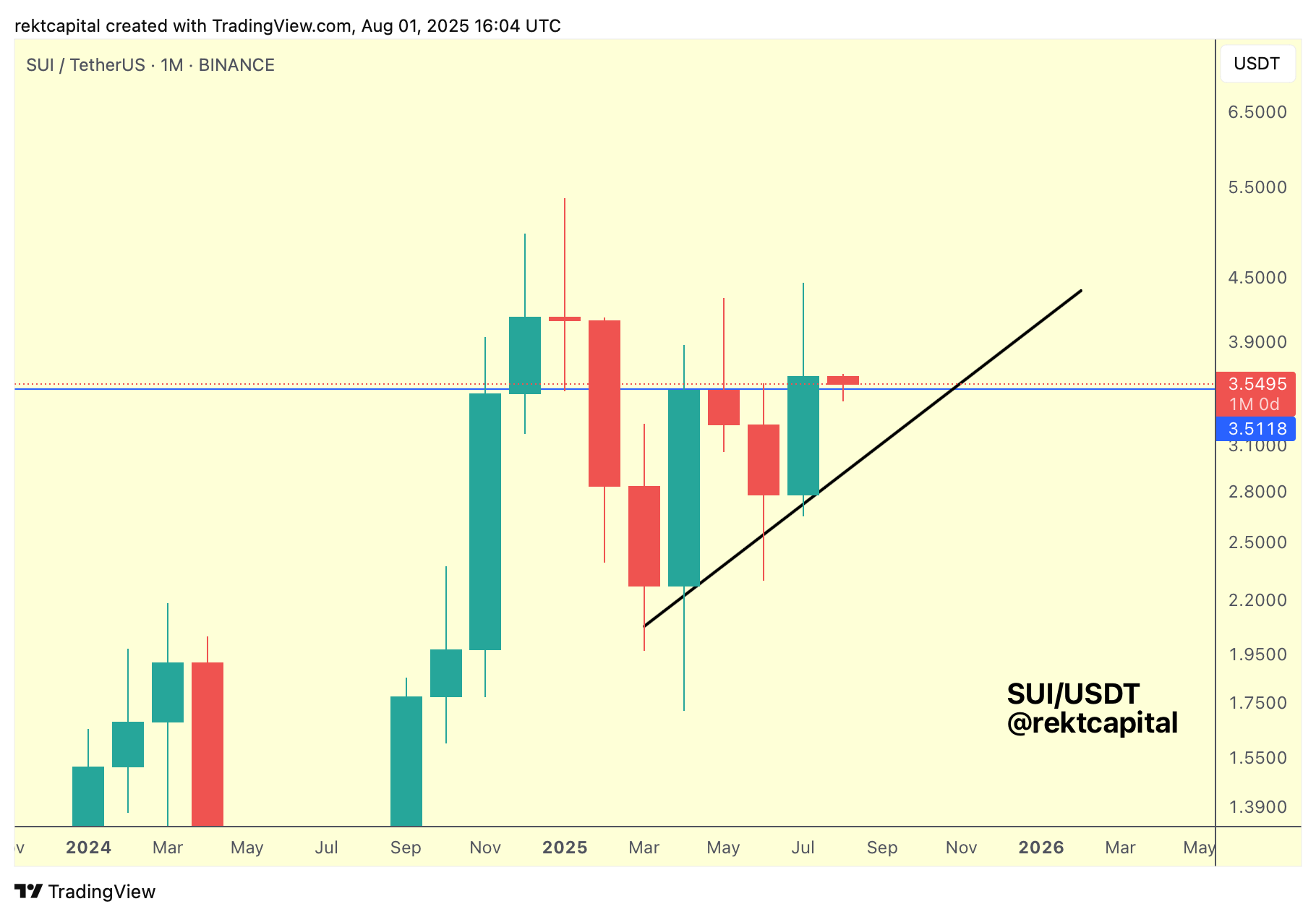 While the worse-case scenario would be SUI dropping into the black technical uptrend line, if SUI needs to do that to form a Monthly downside wick and ultimately Monthly Close above the blue level this August, that would probably be the most volatile retest SUI could healthily muster while maintaining Macro market structure (though wicks have even briefly gone below the Higher Low on the previous occasions in recent months).