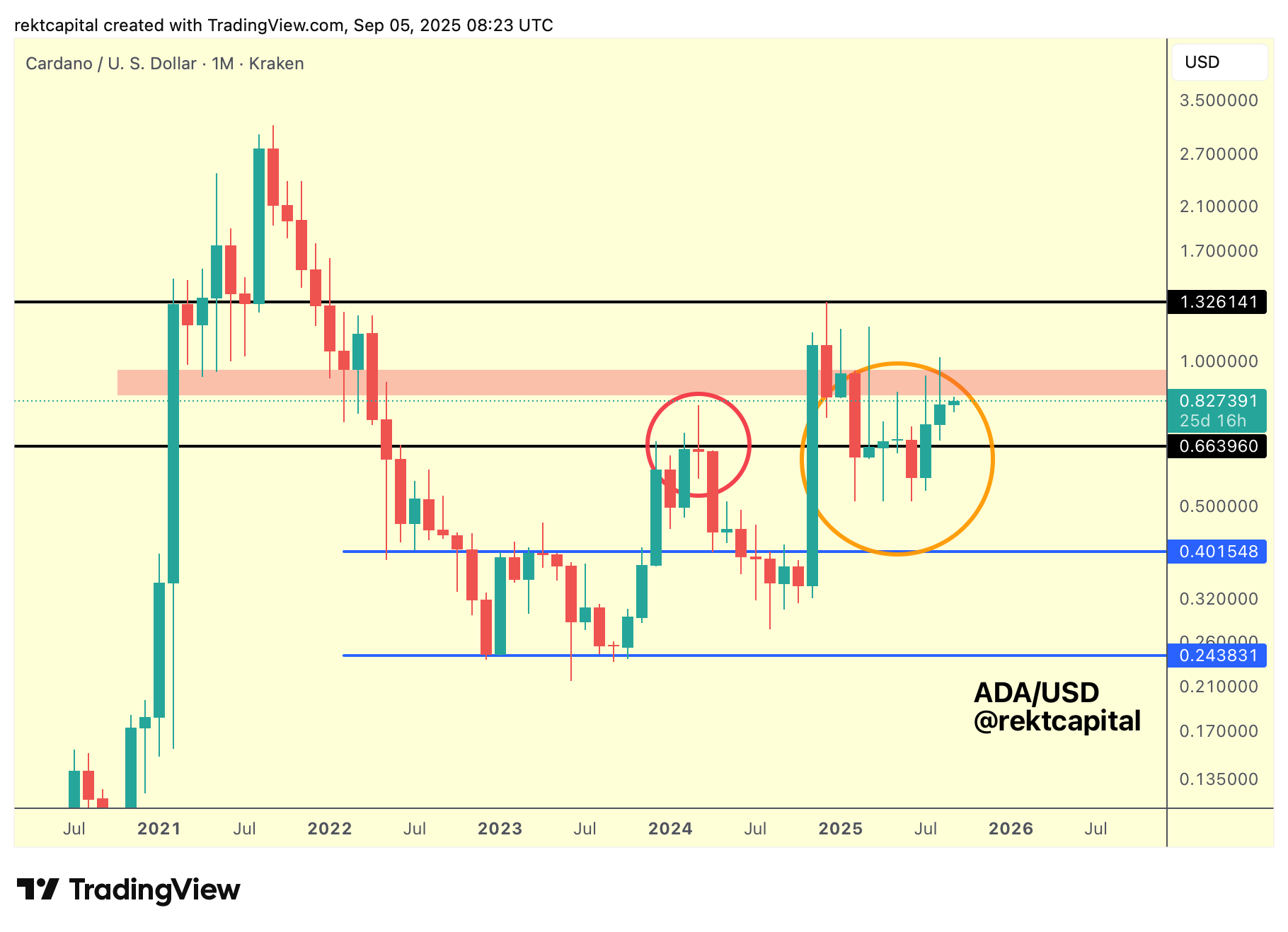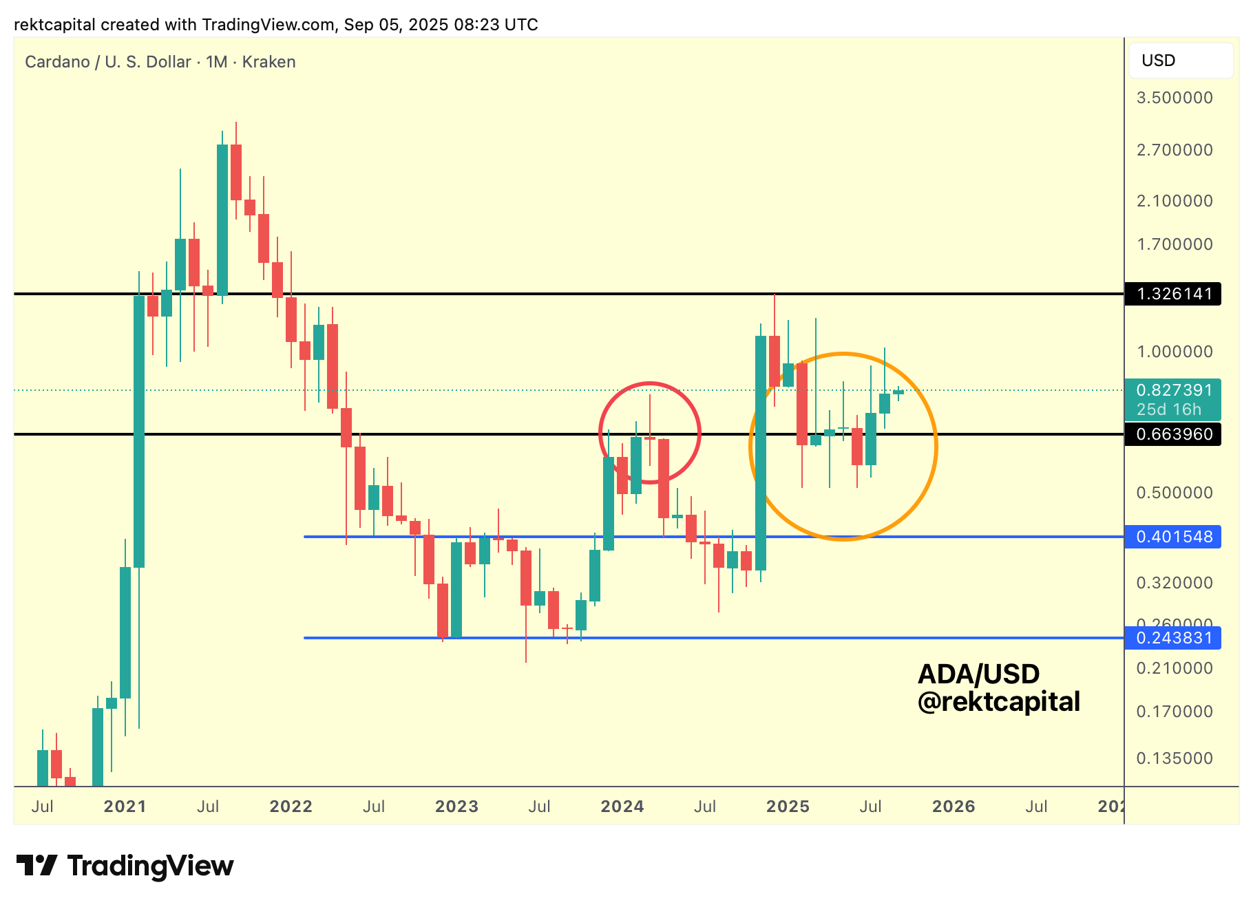 Since then, ADA has been in a downtrending retest period, repeatedly revisiting the $0.66 level as new support. There were deviations below this level (orange circle) but price has gradually reclaimed it with greater sustainability.