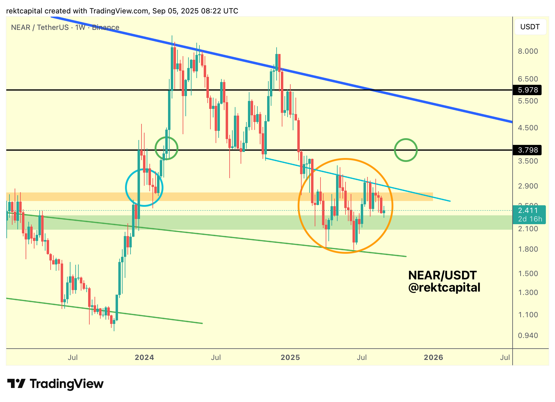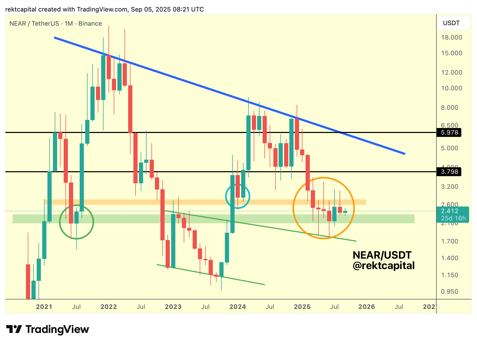 Breaking this 2025 downtrend (light blue) would effectively reopen the broader Monthly range (black-black) that NEAR occupied for much of 2024, with $3.80 (black) serving as the first key level inside it.
