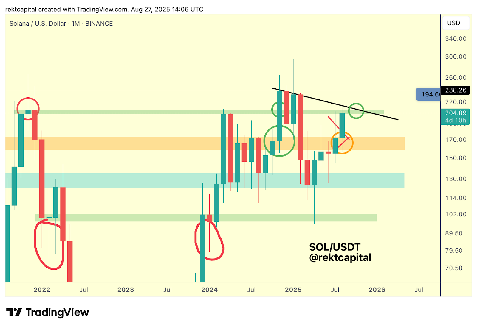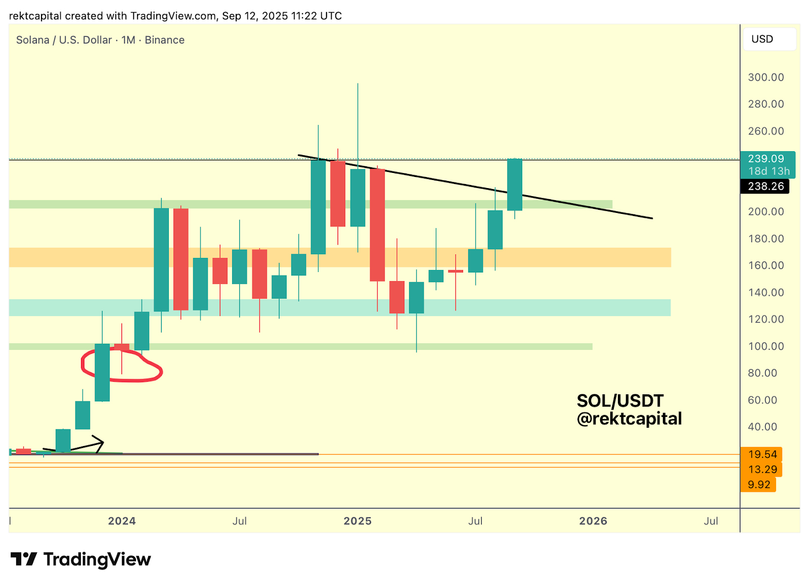 At the same time, SOL faces its final major horizontal Monthly resistance at $238.26 (black).