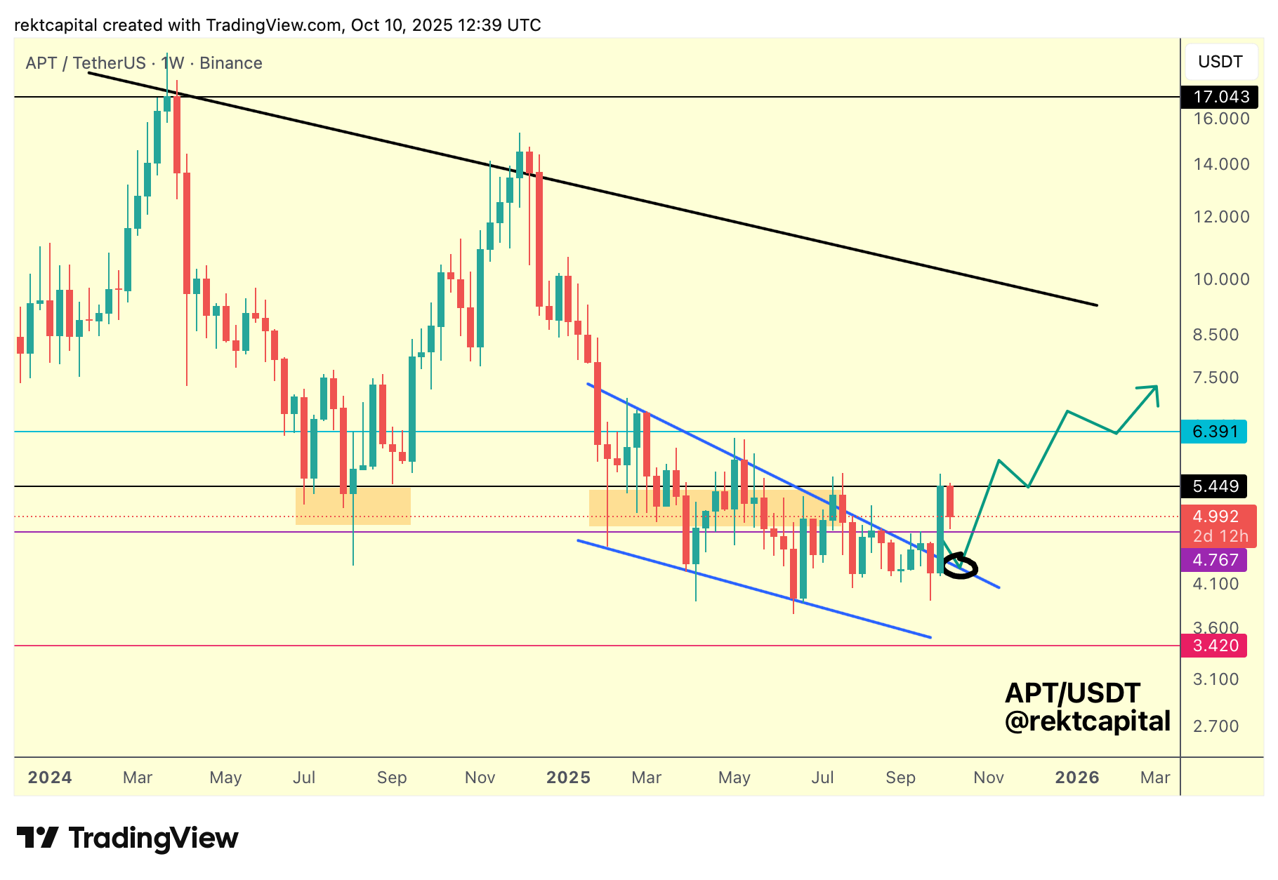 After rejecting from the black level, APT has retraced towards $4.76 (purple), a Monthly level that historically invites downside wicking and deviation before support is re-established.