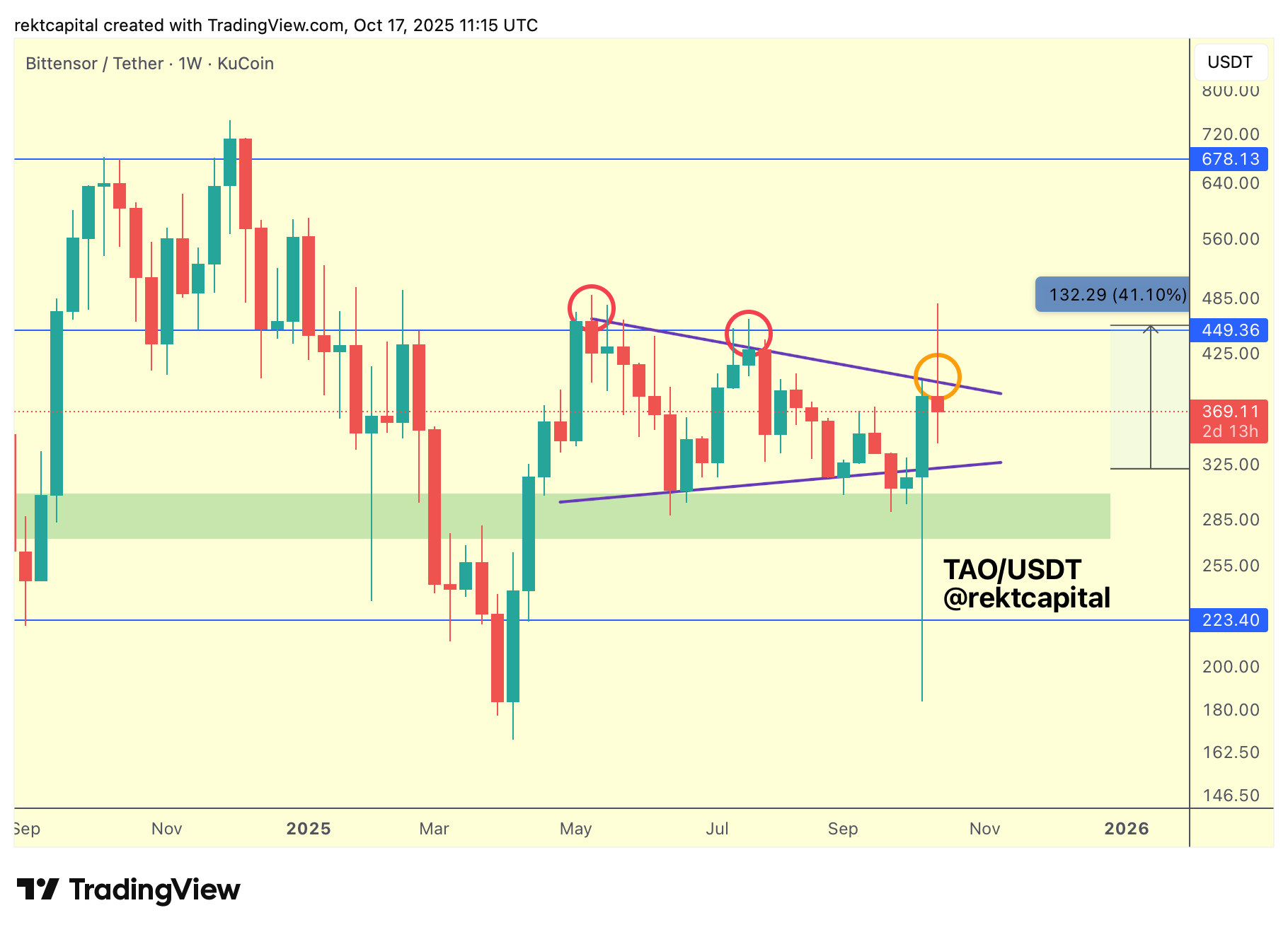 Following that rebound, TAO has rallied into two key resistances — the diagonal trendline (purple) and the horizontal resistance at $449.36 (blue) — but currently trades just beneath both.