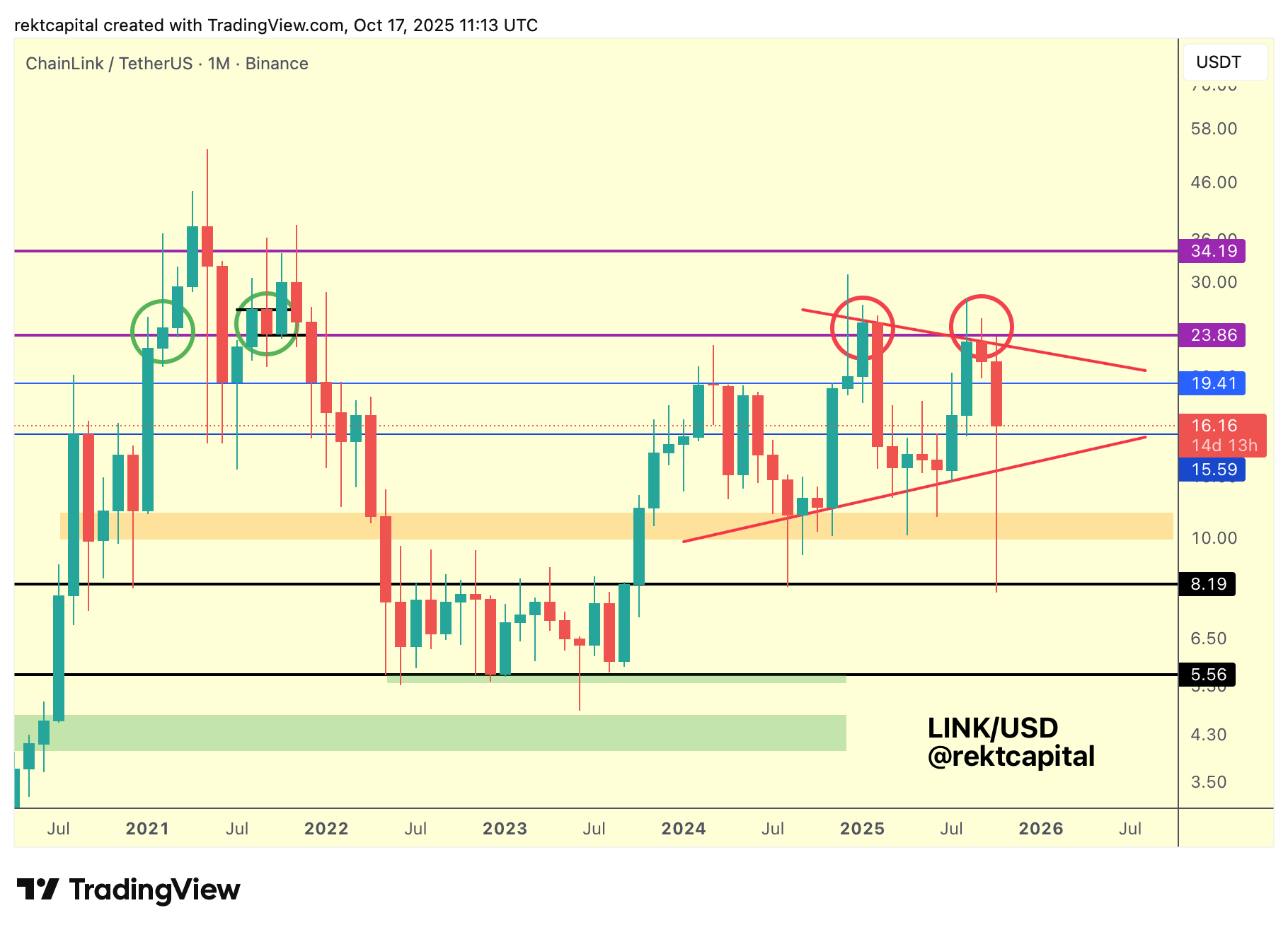 At present, LINK is oscillating within the $19.41–$15.59 (blue) mid-range, a region that historically coincides with the 2020 highs and the 2021 reversal lows.