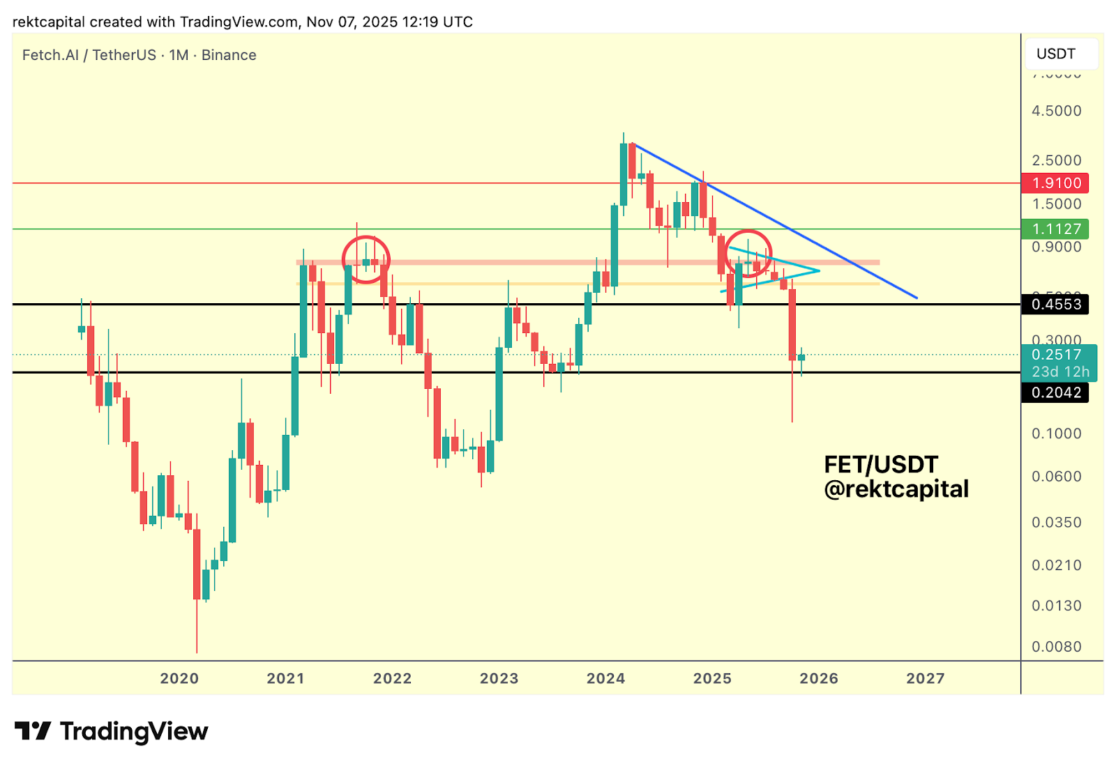 A significant downside wick during the recent liquidation event captured liquidity below the range, but the Monthly Close above $0.20 re-established stability inside the Macro Range.