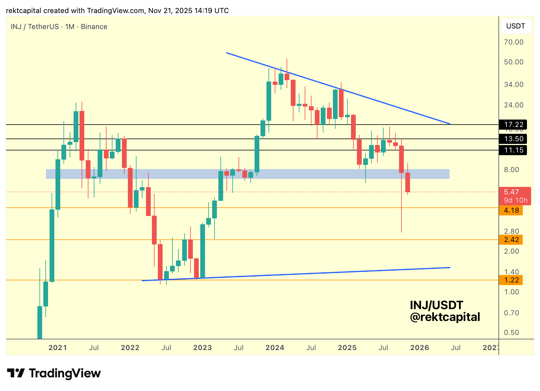 Injective is currently testing a historically crucial Monthly pivot. A region that has repeatedly acted as the mean within this broader multi-year structure, supporting upside deviations above it while catching downside deviations below it.