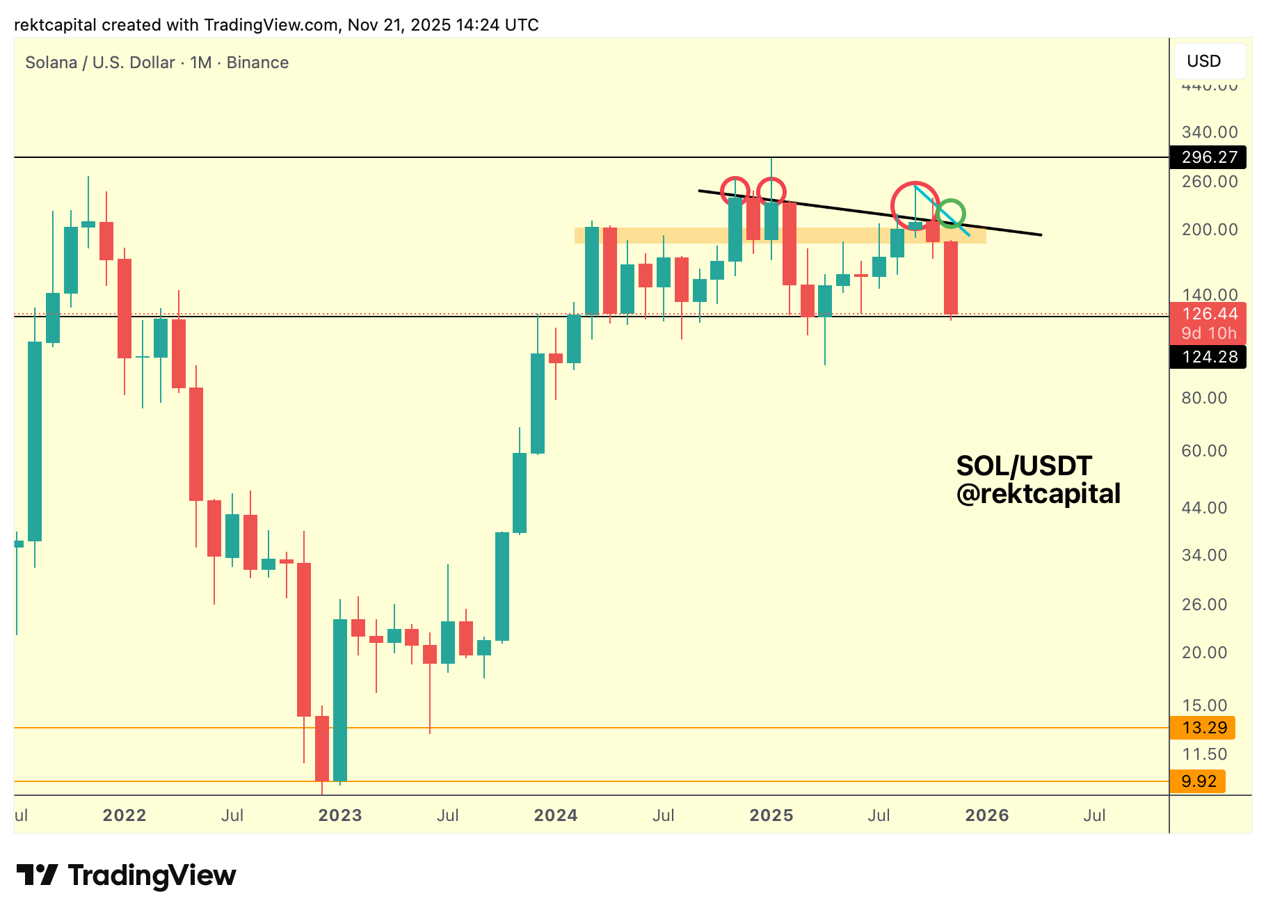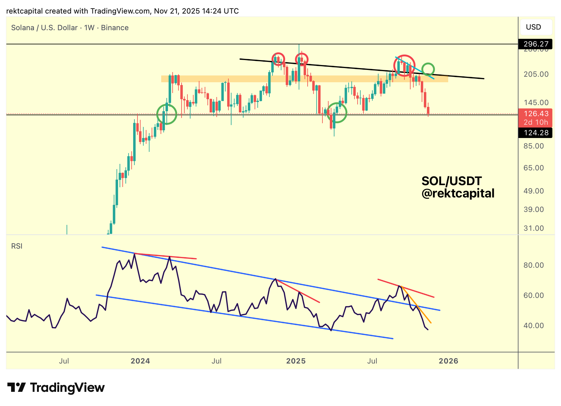 Historically, reclaiming and retesting that level allowed rallies toward $200 in more bullish climates, but this cycle is different: Solana is up more than 14x, and market conditions are turning more bearish.