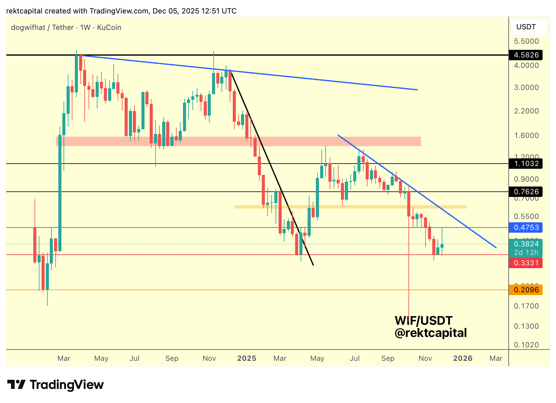 Until WIF can Weekly Close above the macro downtrend and retest it as support, or reclaim $0.4753 with successful confirmation, the market will continue navigating weakening reactions within this established range with downside risk increasing if diminishing returns persist.