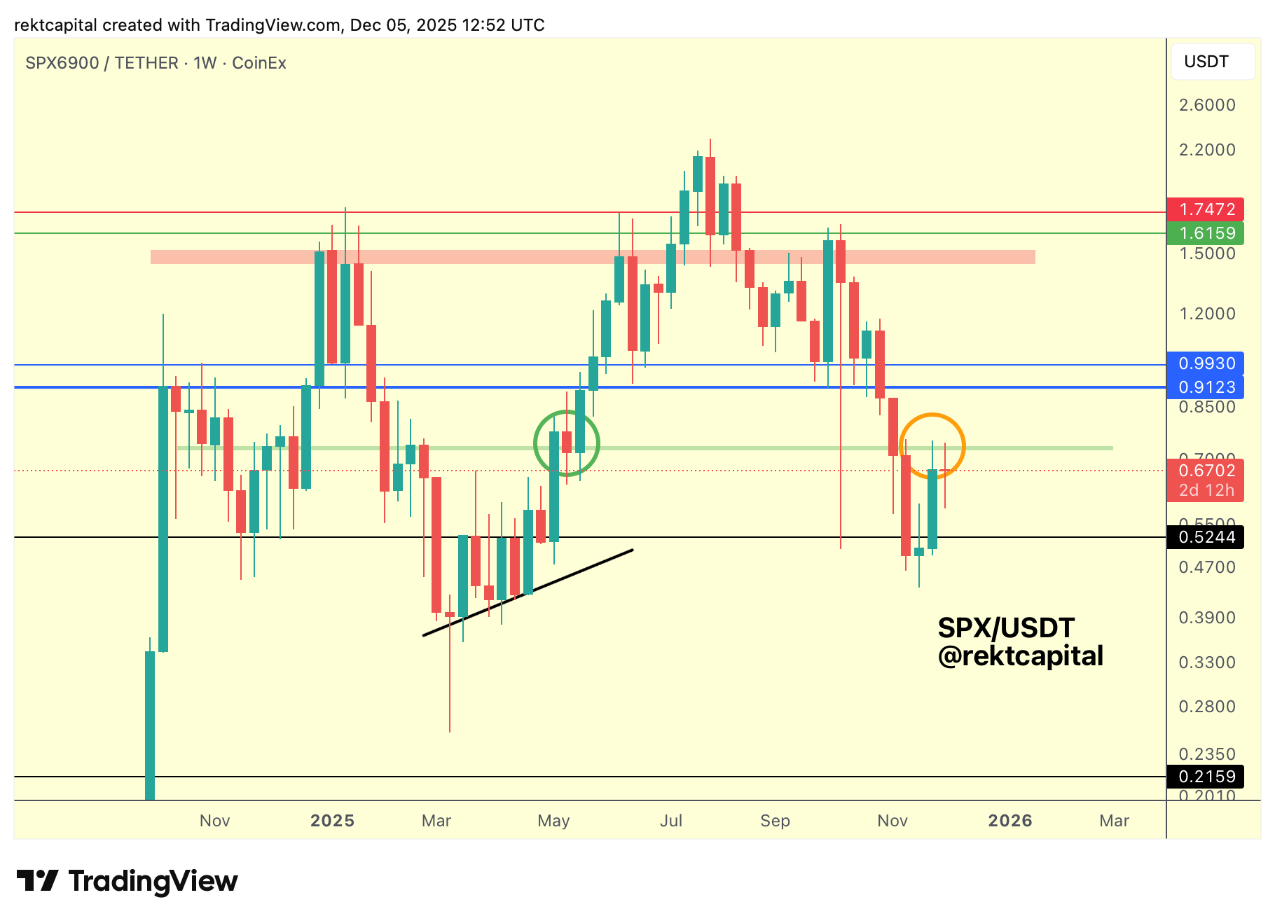 SPX has recently rebounded from the $0.5244 (black, 50-cent region), consistent with its broader behaviour of rallying in $0.50 intervals.