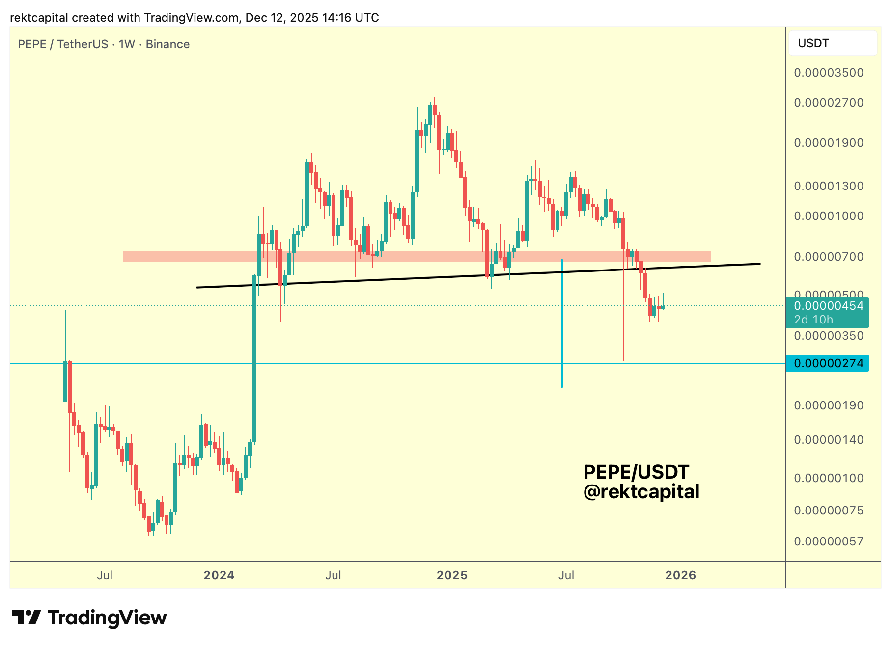 Failure there would expose PEPE to downside beyond the original Measured Move, toward earlier historical price action.