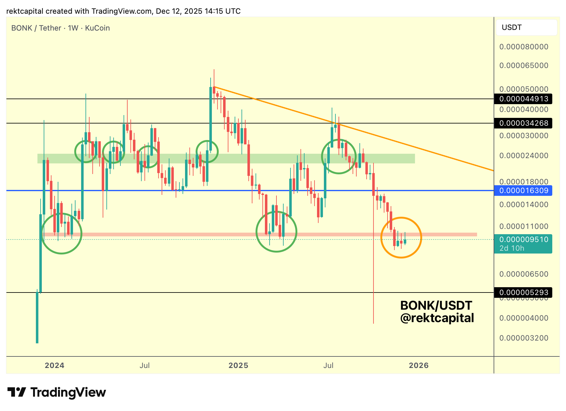 If BONK fails to Weekly Close above this red region and retest it as support, then the market faces a wide pocket of price action beneath, where new supports and resistances would need to form between the red region and the black level below.
