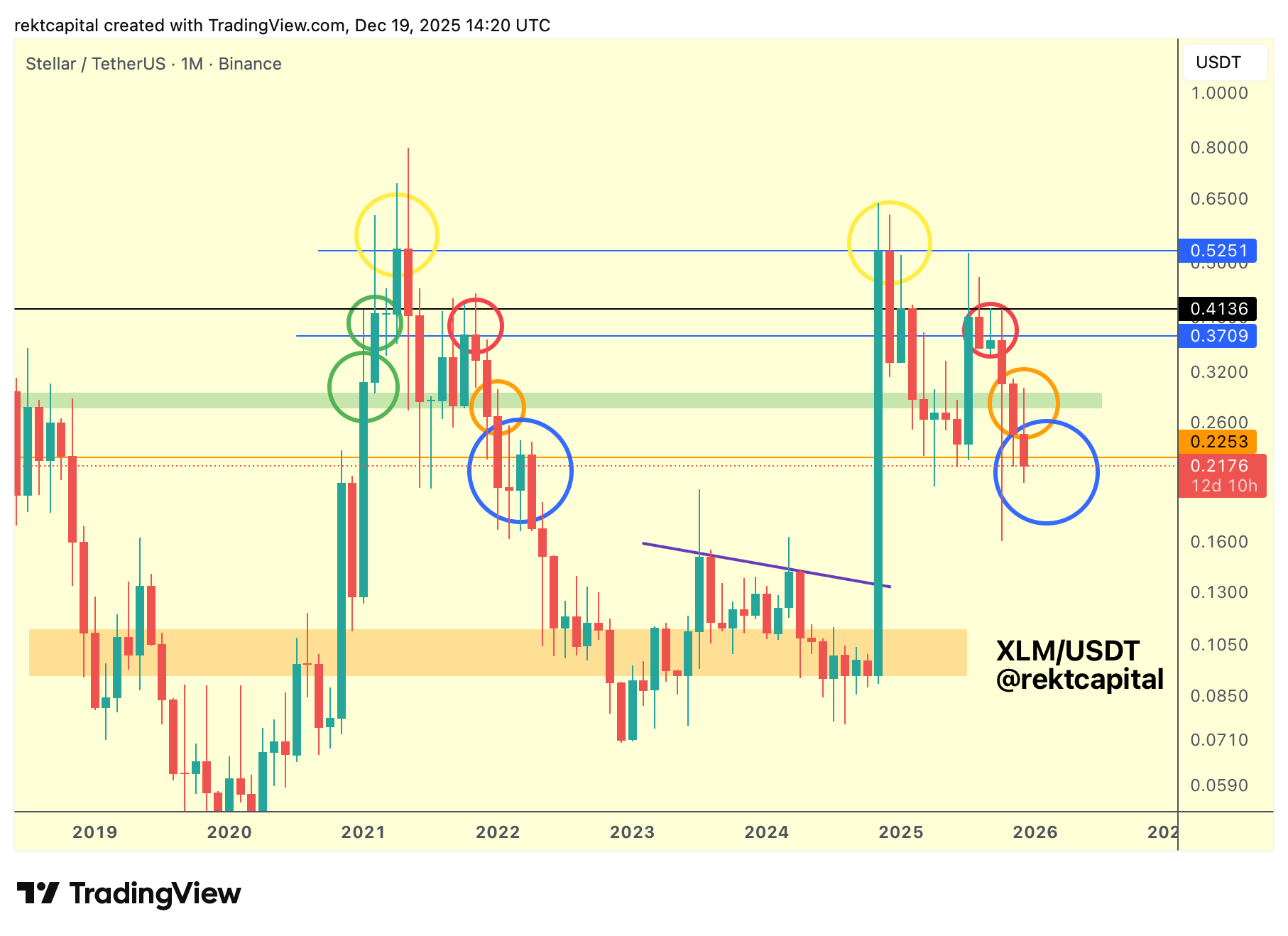 However, a Monthly Close below the ~$0.22–$0.225 area would firmly position XLM for early-2022-style distribution, especially given how closely this cycle has tracked 2021 so far.