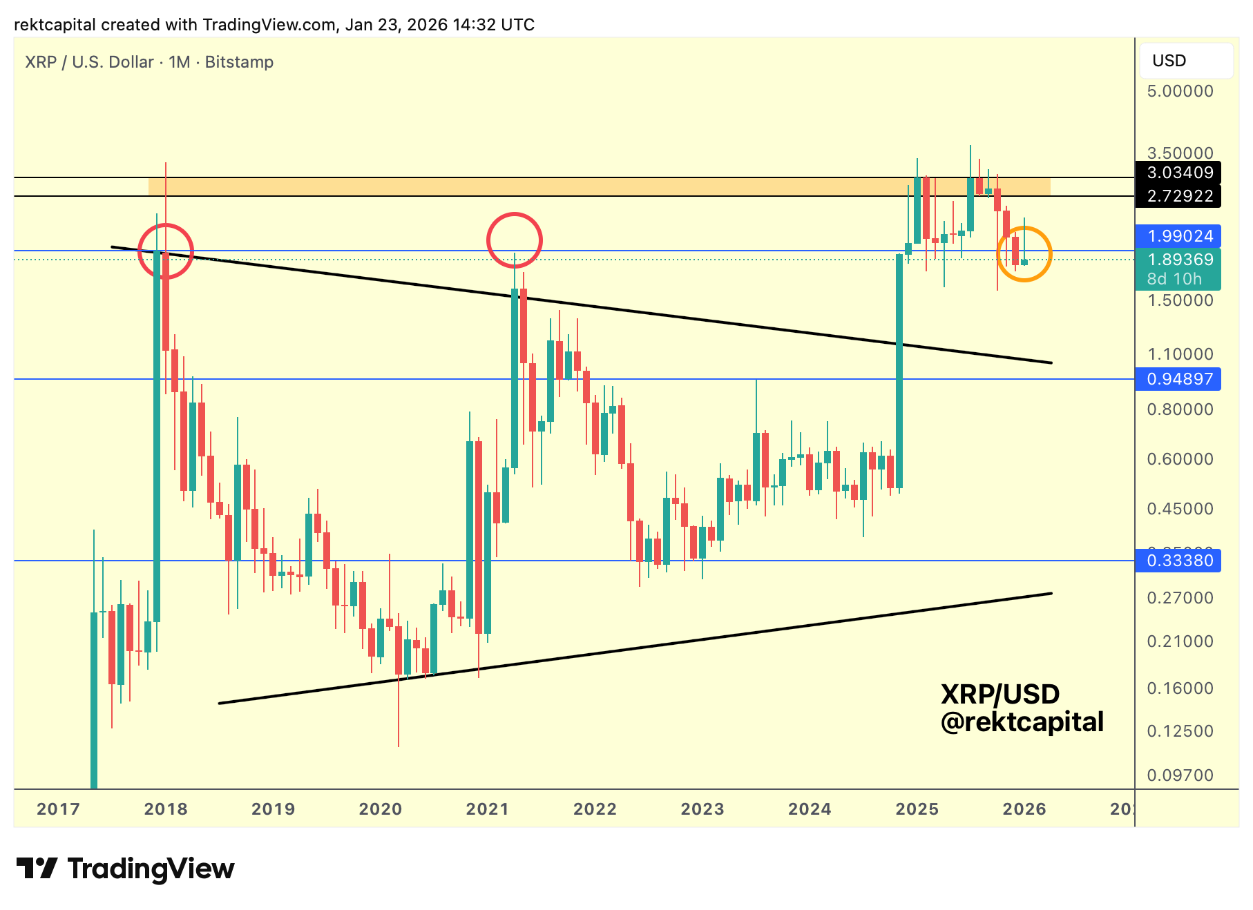 Price Monthly Closed below $2, and in doing so, has begun to turn this former support into new resistance from the underside, placing XRP back at a structurally vulnerable inflection point.