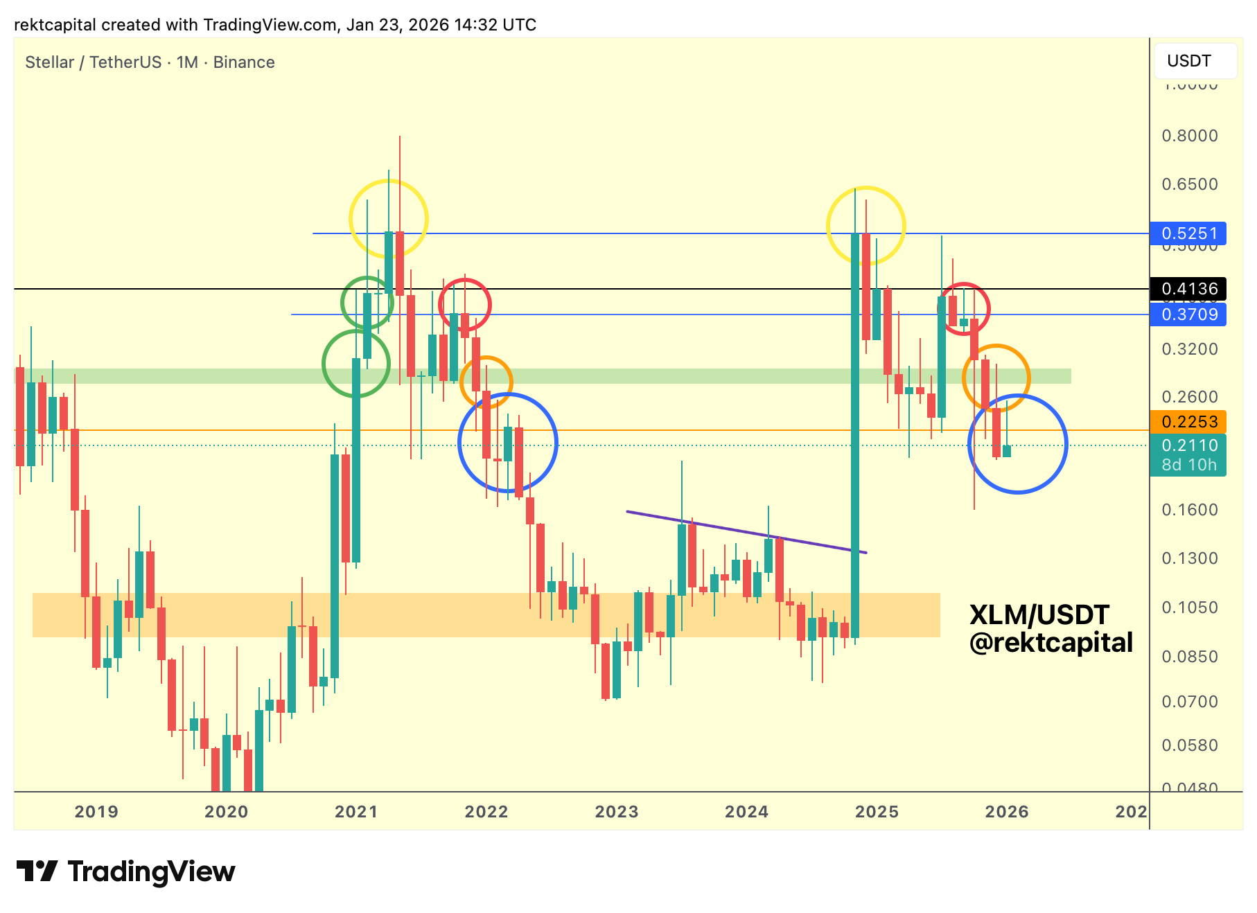 In the prior cycle, XLM Monthly Closed below this level, flipping it into resistance and entering a prolonged distribution phase.In the current cycle, XLM has now also Monthly Closed below $0.225.