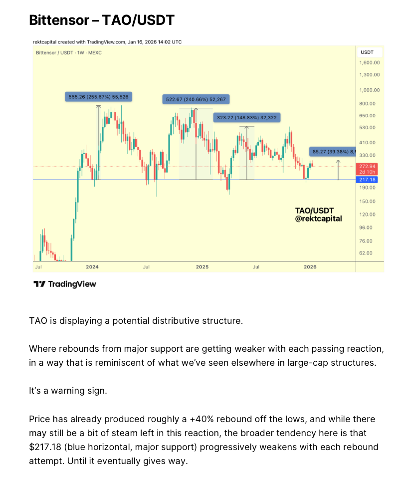 Historically, TAO produced rebounds of roughly +250%, then +150%, and most recently just a ~+40% move, a clear sign of diminishing demand and a developing distributive structure rather than accumulation.
