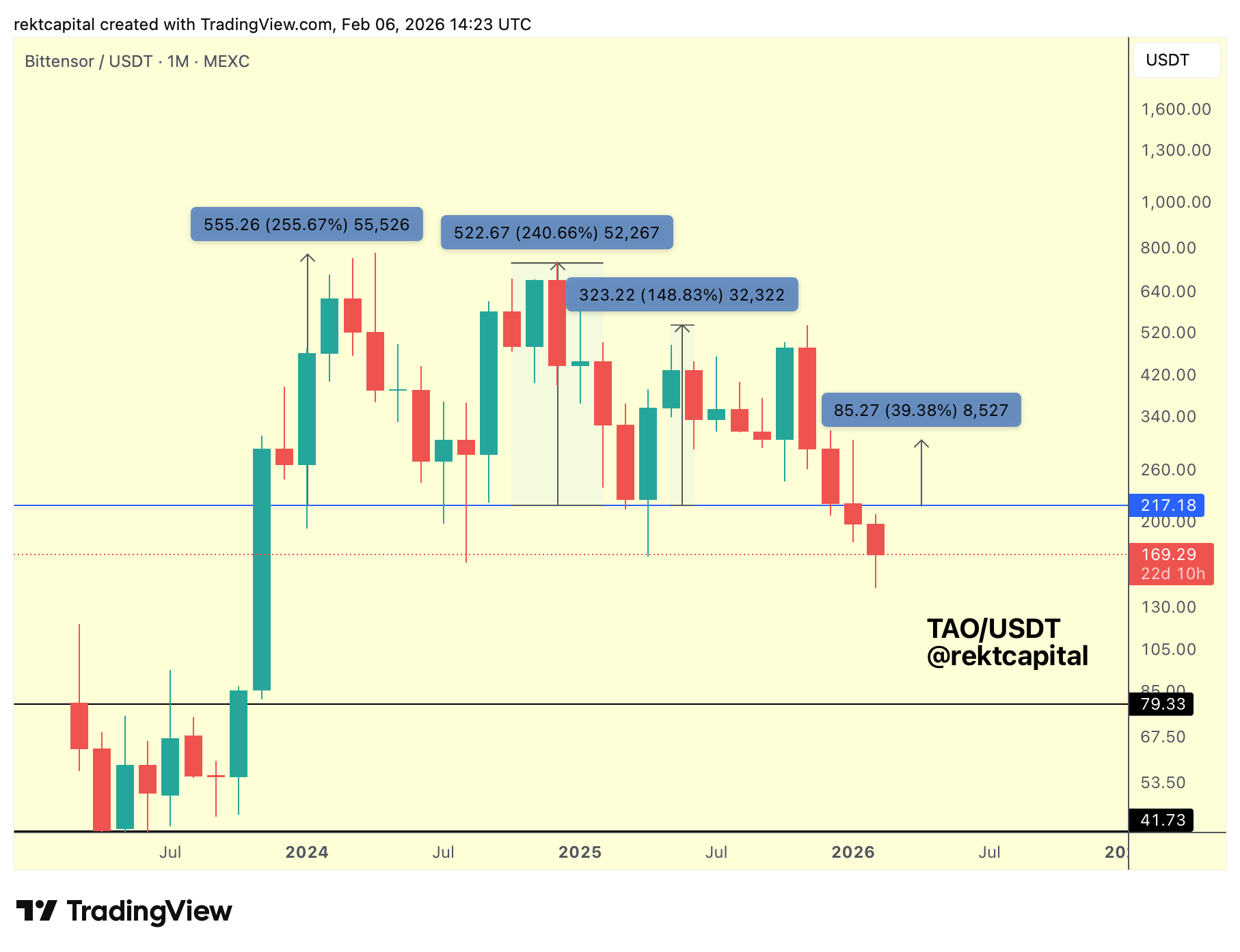 Whether TAO formally tags $217.18 from below to confirm it as resistance or continues distributing without a clean retest, the higher-probability outcome over time is a move into the $79.33–$217.18 range, an area where price previously moved too quickly to build any meaningful structure.