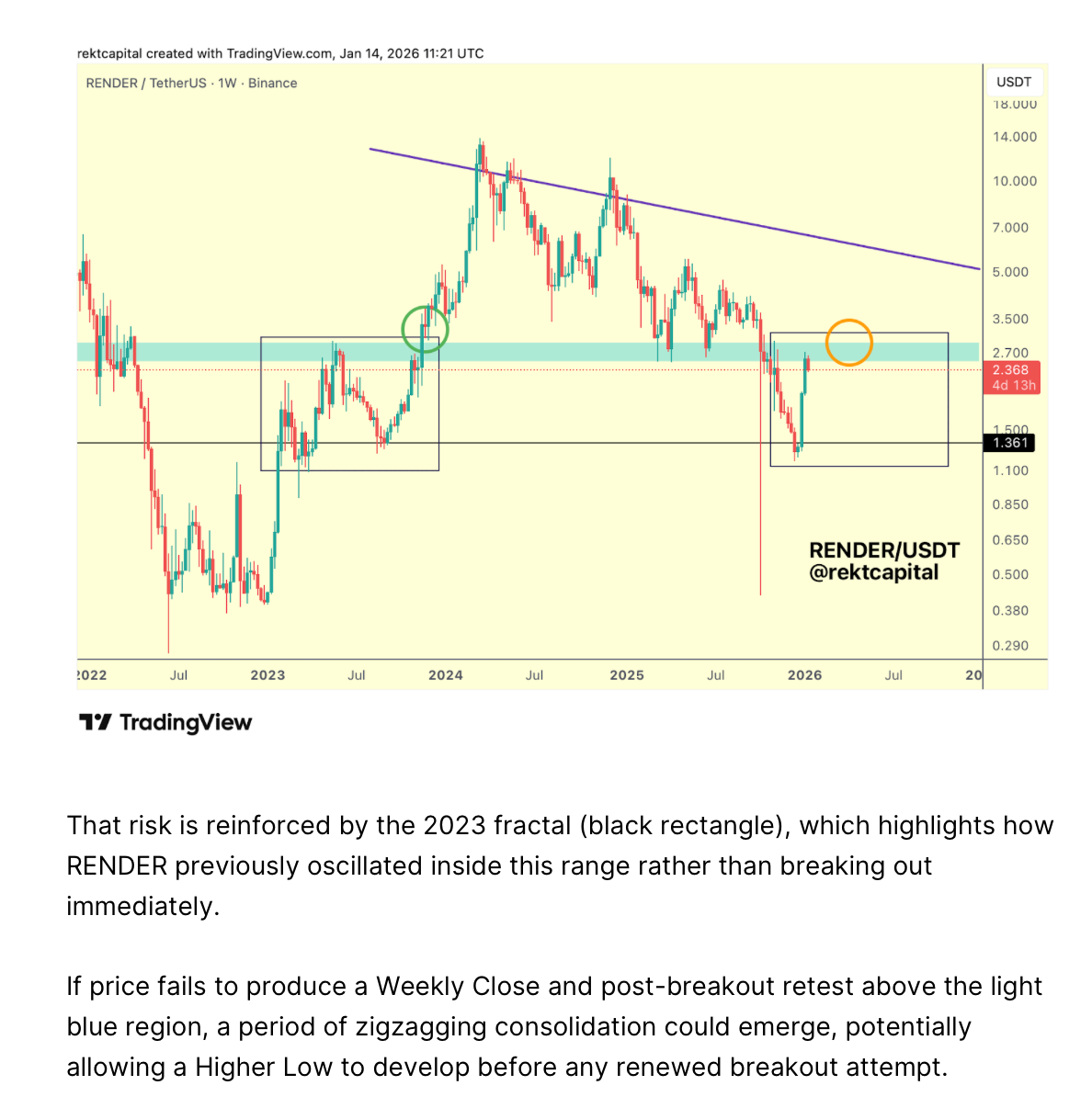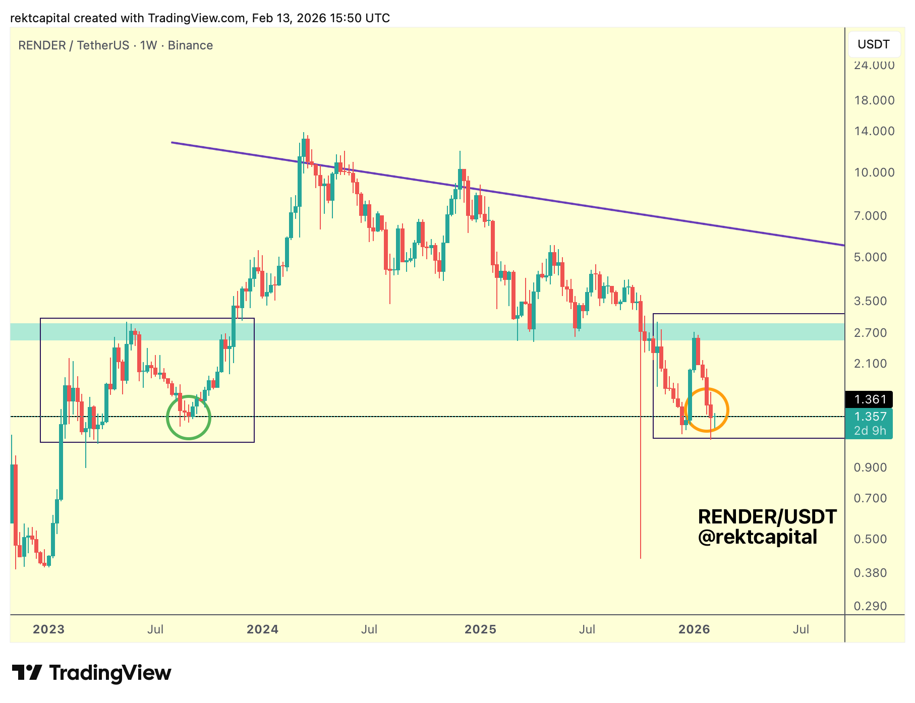 Generally, for repeated upside from here, RENDER will need to hold the $1.36 level as support; it will be important that price doesn't turn this level into resistance this week and so a Weekly Close above $1.36 is essential to maintain inside the Range.