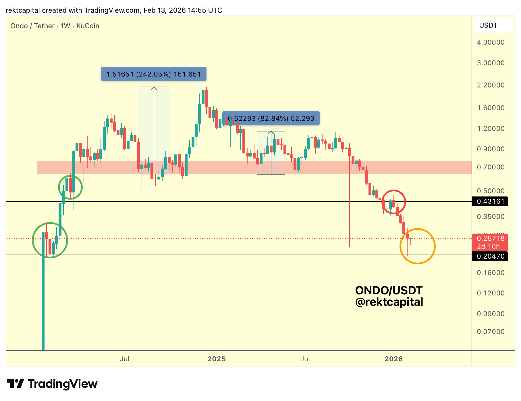 ONDO had a support in the red region, which generated a +242% rally and then a +82% rally; progressively weaker rebounds demonstrating weakening buy-side liquidity at the red area of support.