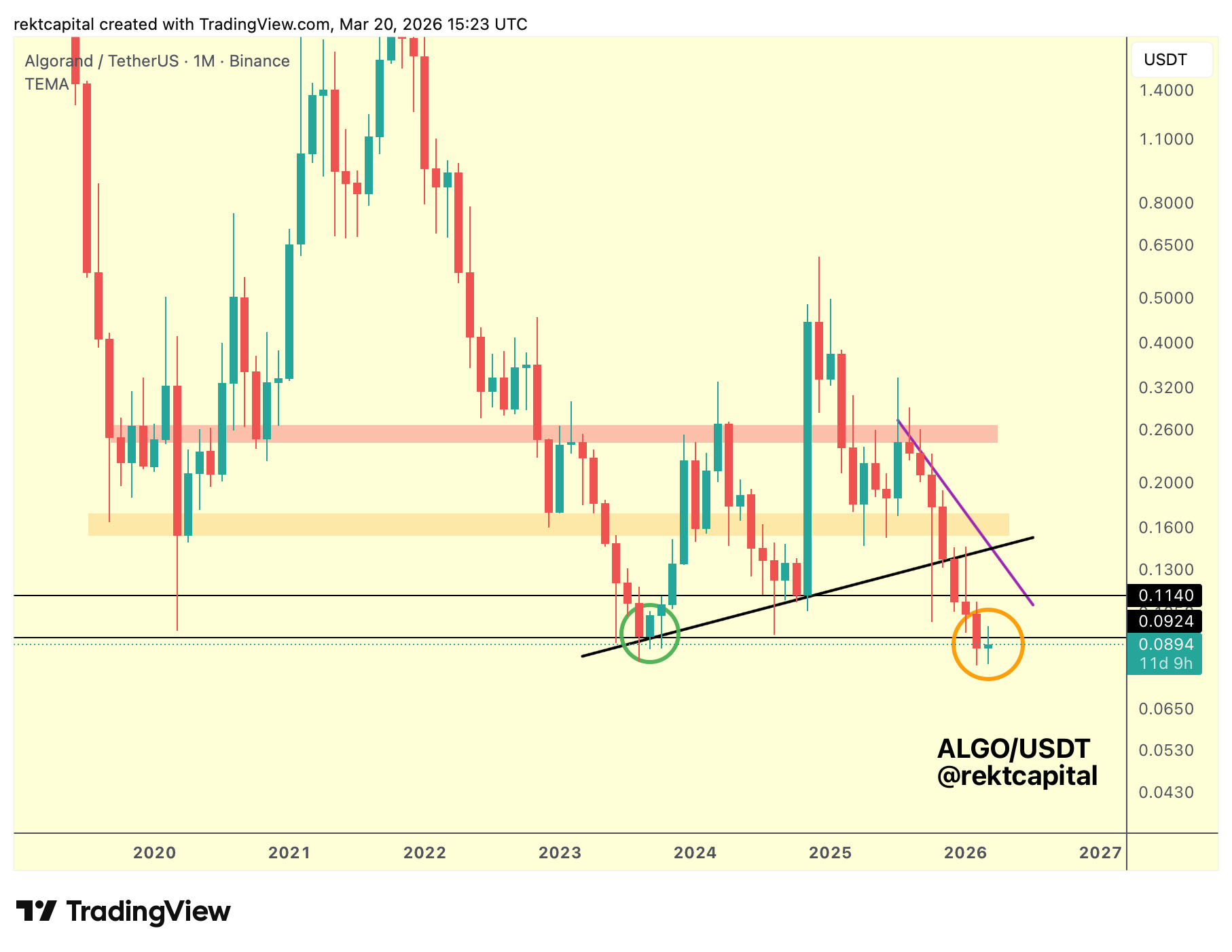 Algorand has lost its multi-year Macro Uptrend (black trendline), with price turning that structure into resistance via a post-breakdown retest.