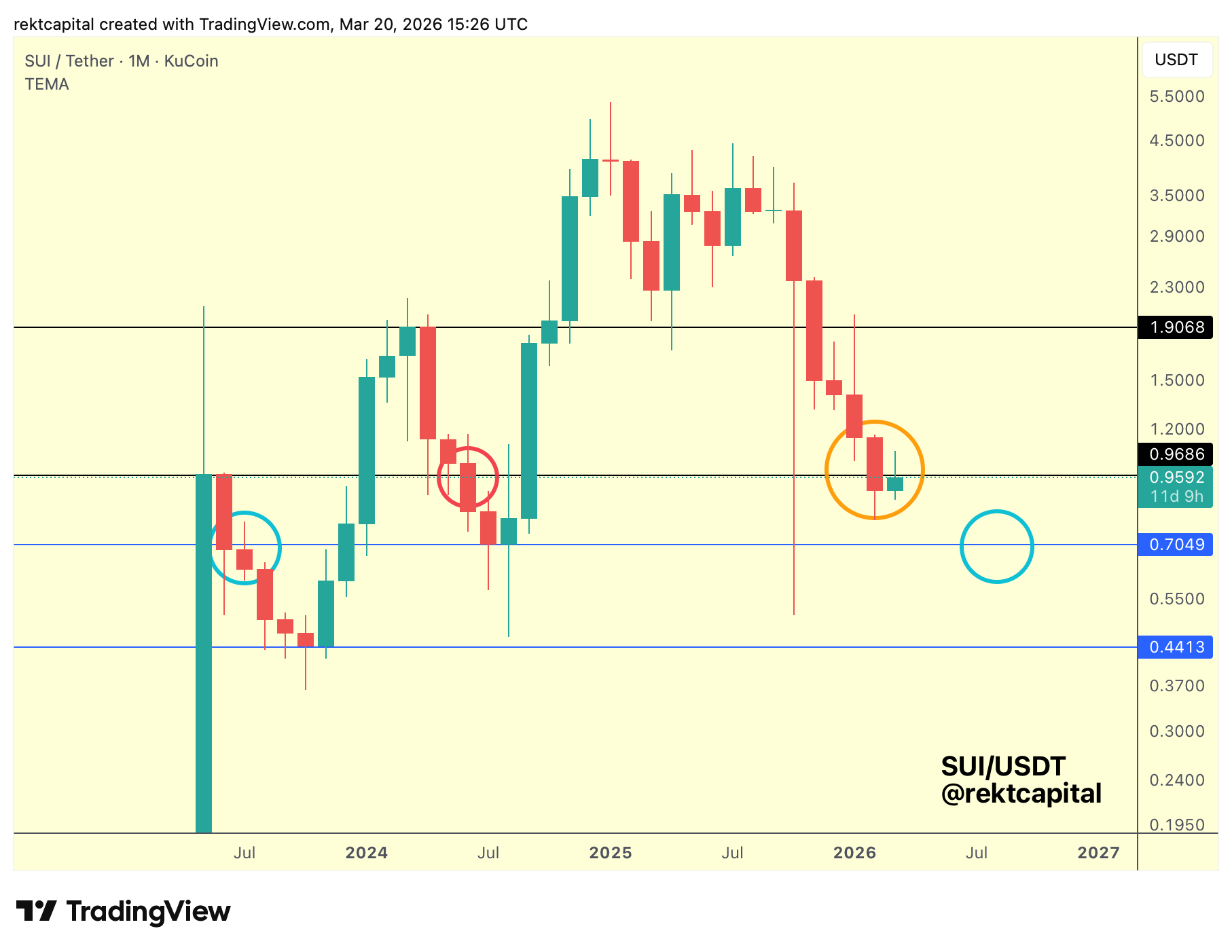 Sui has Monthly Closed below the $0.96 Macro Range Low (black) last month, which now means that price is positioned for a potential bearish retest of said level into new resistance.