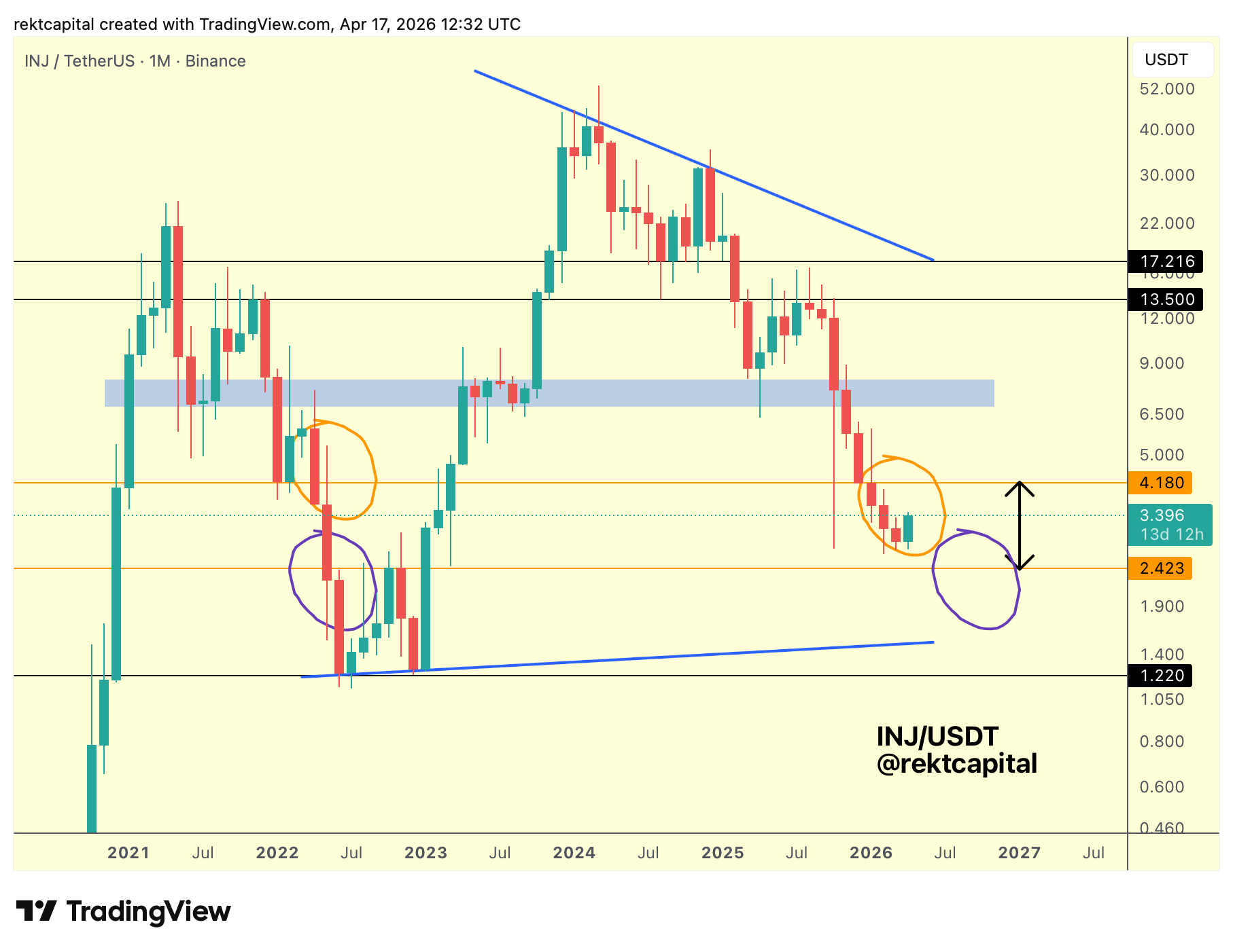 Injective has followed through on the fractal from 2022, rejecting from the $4.180 (orange horizontal, Range High resistance) level.