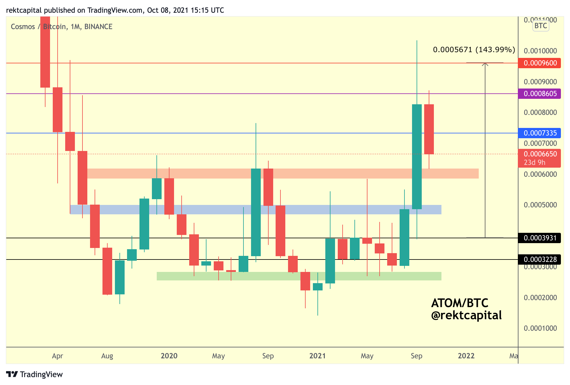 This month, ATOM has retraced the majority of the gains ATOM had made beyond this red resistance area.