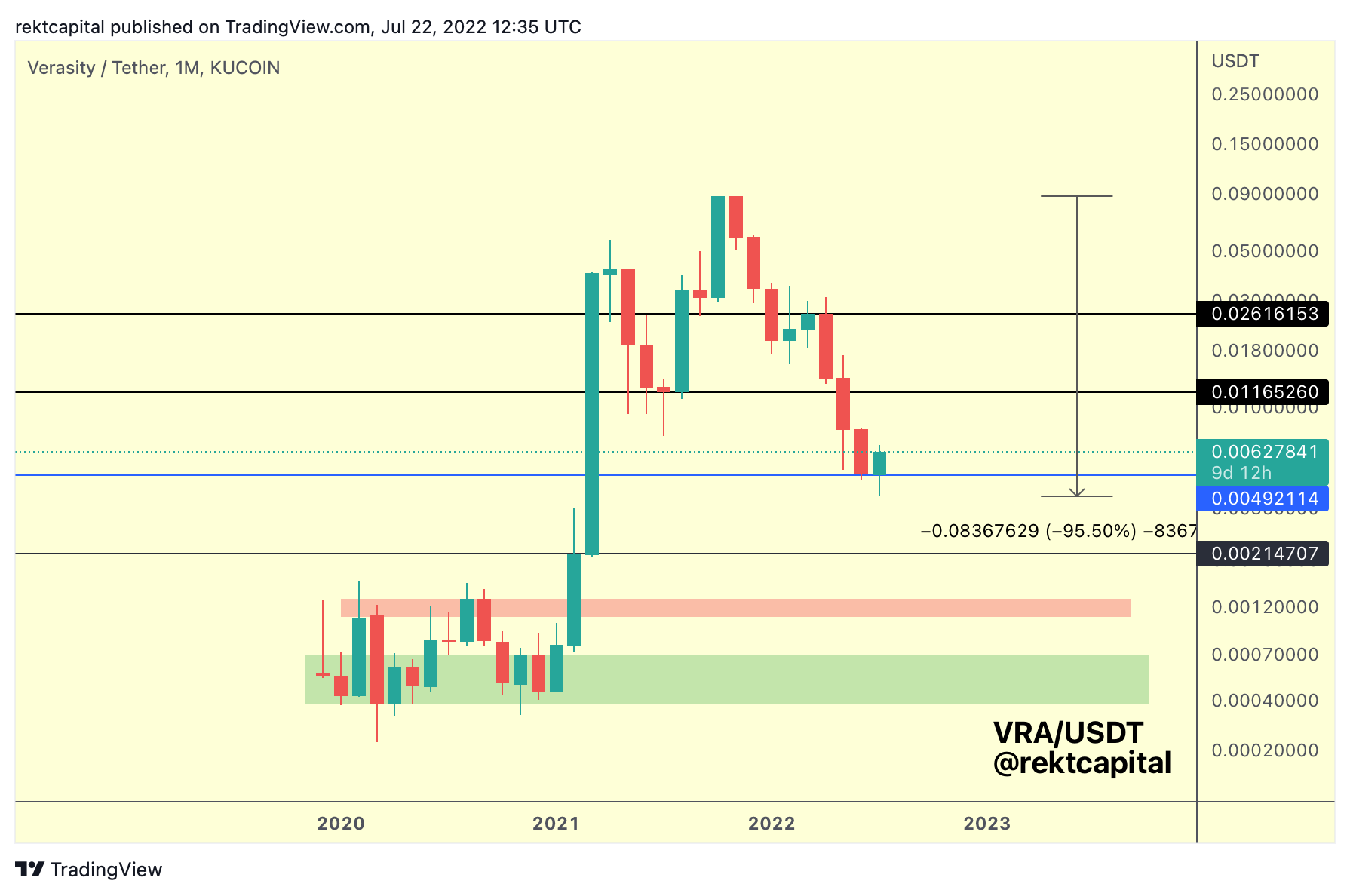 Technically, it would make most sense for VRA to develop a bottoming out structure at either a major Monthly support or at the red region - the top of the Accumulation Range wherein the previous Bull Run began.